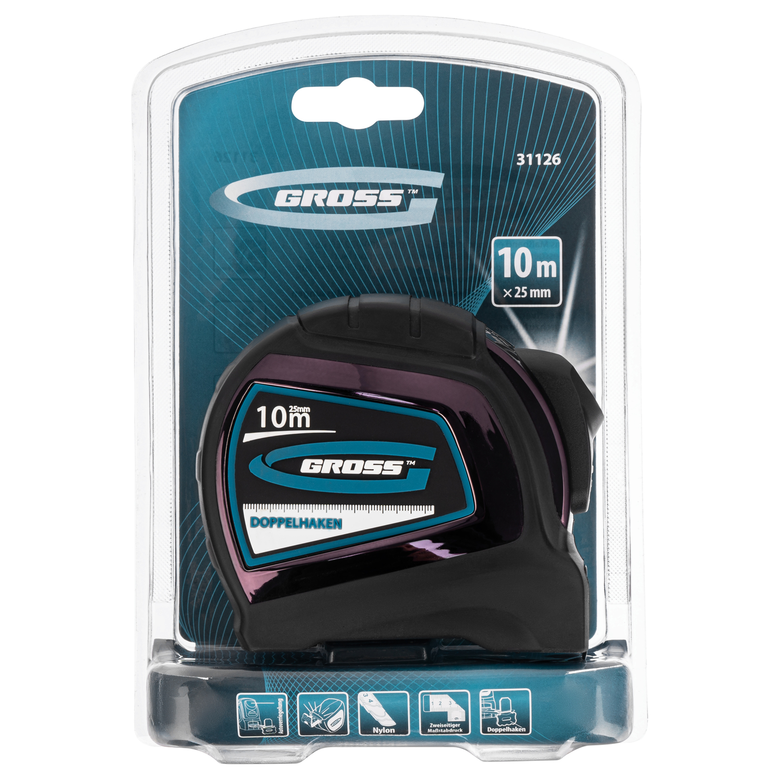 Автоматическая рулетка Gross «Doppelhaken» 31126 с двухсторонним зацепом, лентой размером 10 м x 25 мм, с двухсторонней шкалой и нейлоновым покрытием, предназначена для проведения измерений стен, полов, различных материалов и конструкций. Пригодится на строительной площадке и в быту, благодаря широкой упругой ленте удобна для работы в труднодоступных местах.