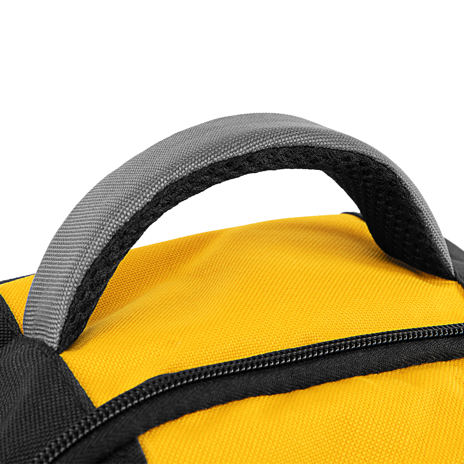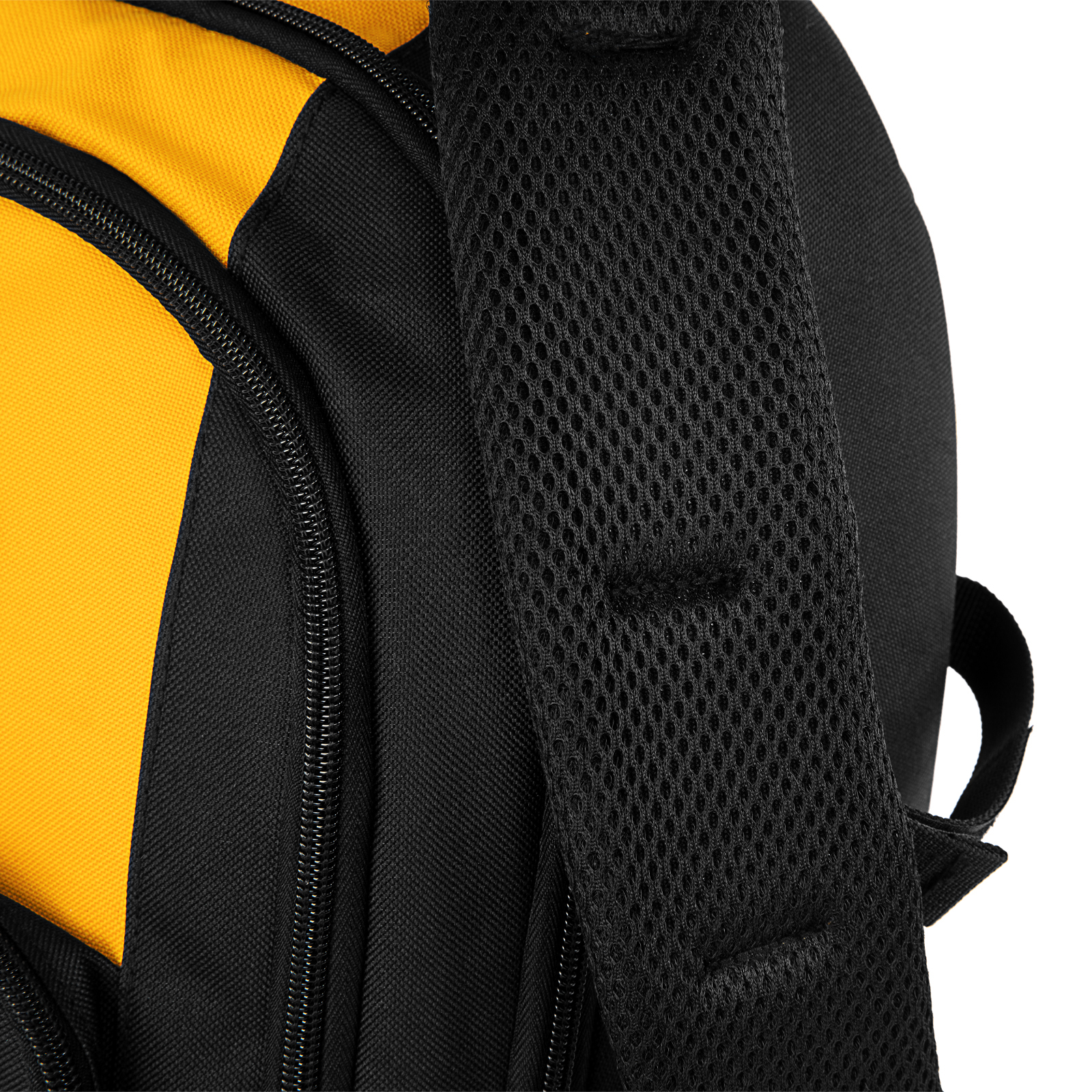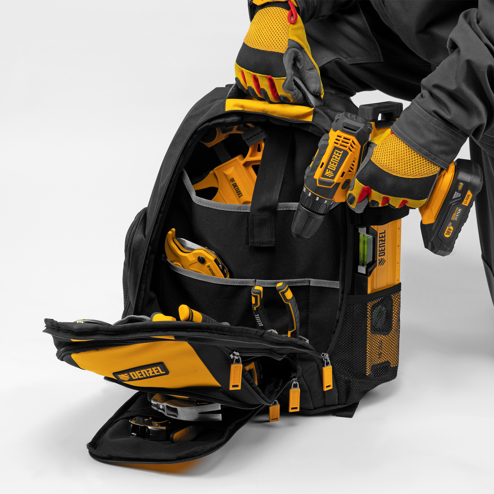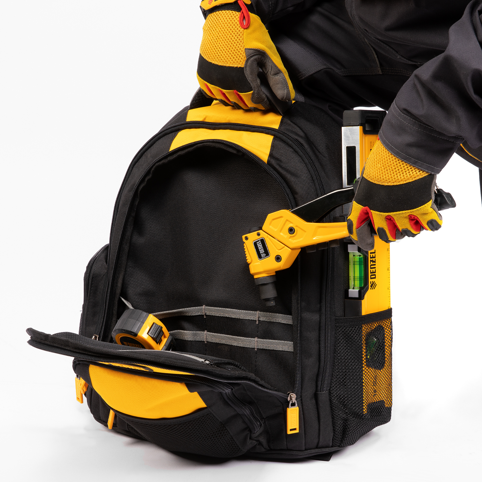 Рюкзак Denzel 90296 размером 365 х 190 х 430 мм, с 3 отделениями и 26 карманами (в том числе сетчатыми), предназначен для размещения и транспортировки ручного инструмента. 3 секции позволяют организовать упорядоченное хранение всех необходимых предметов. Рюкзак пригодится выездному мастеру.