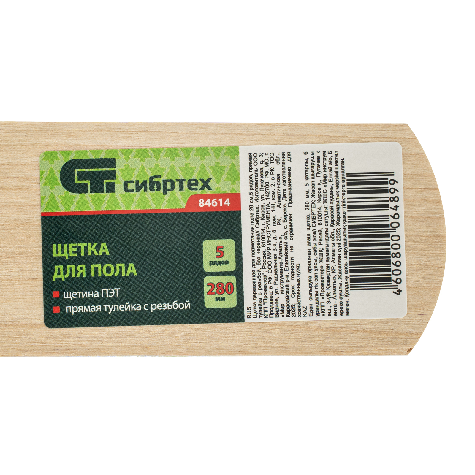 Деревянная щетка Сибртех 84614 длиной 28 см, с щетиной в 5 рядов, с прямой тулейкой с резьбой, без черенка, — хозяйственный инвентарь для подметания пола, дорожек, лестниц, тротуаров, площадок. 5-рядная щетина обеспечивает высокое качество уборки в помещениях и на улице. Тулейка щетки совместима с черенком 68416.