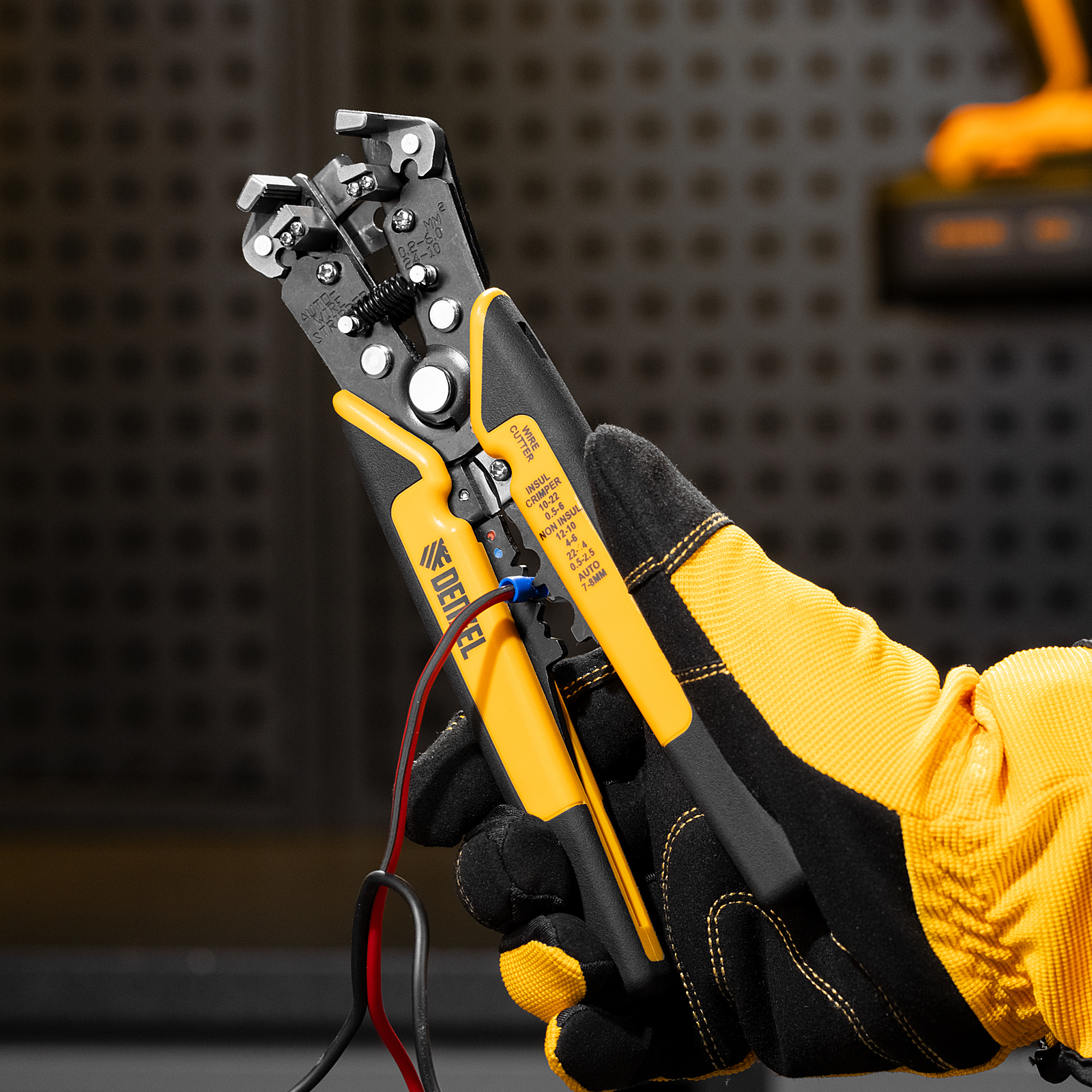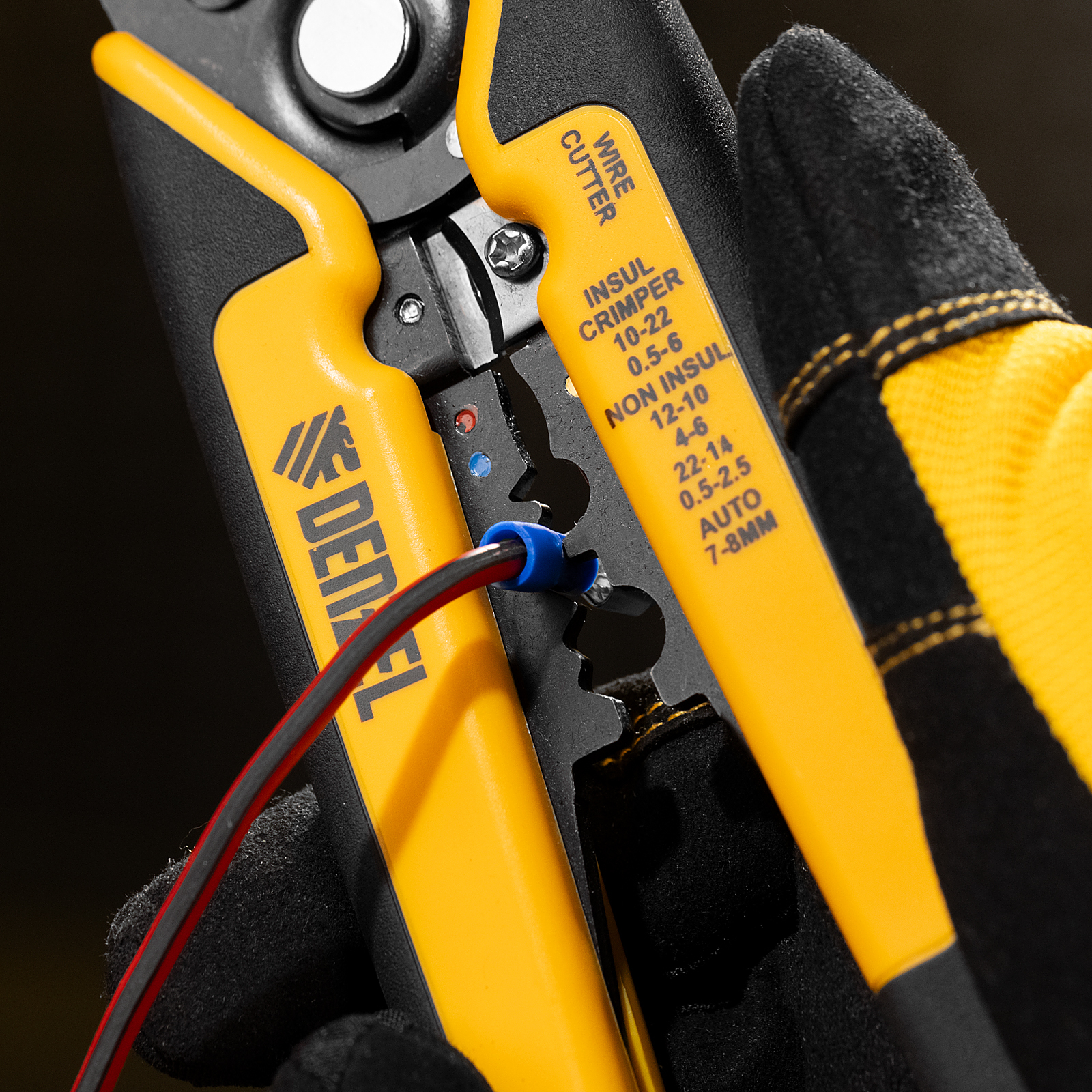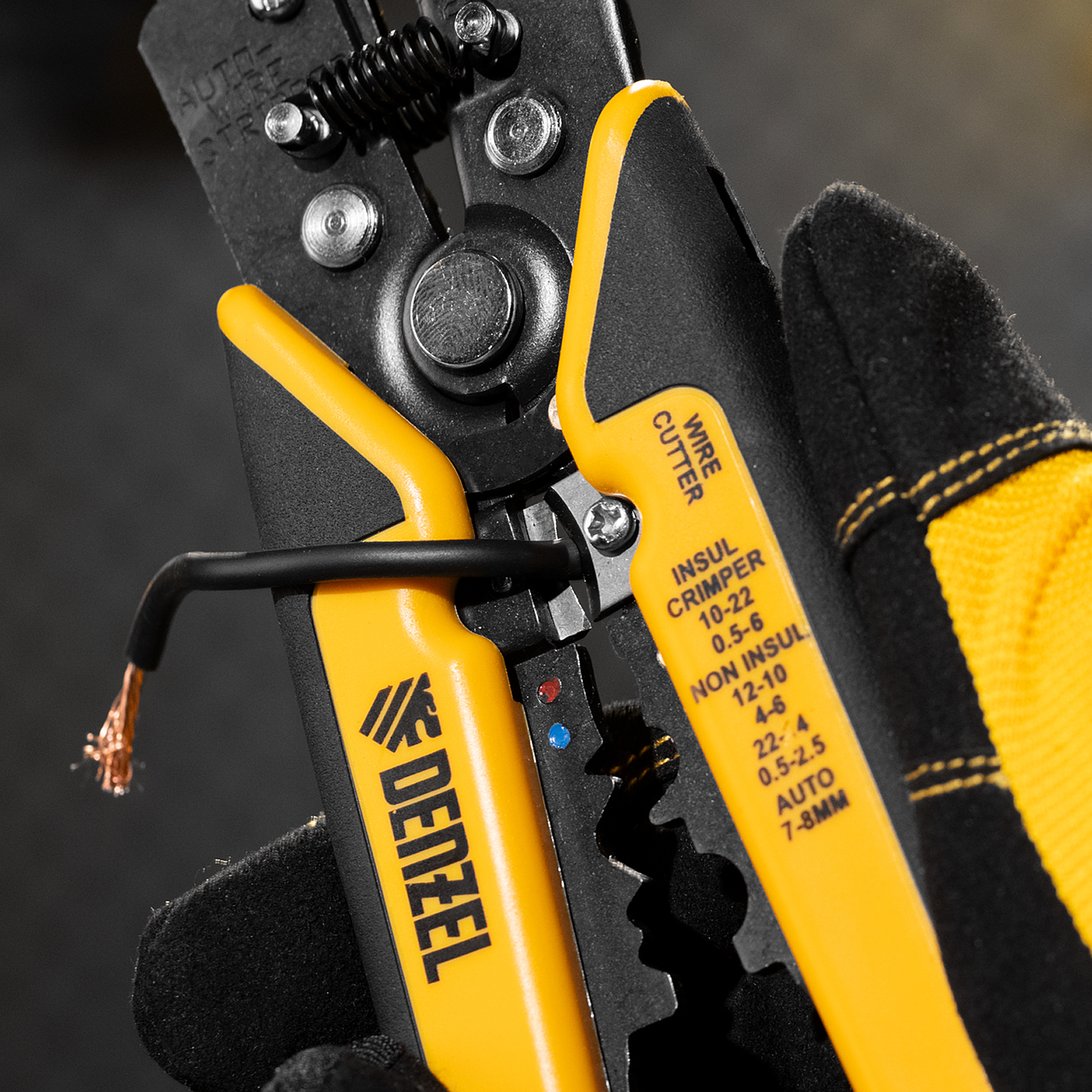Щипцы Denzel 17742 — инструмент для зачистки электропроводов сечением 0,2-6 мм2 (22-10 AWG), способный дополнительно выполнять функцию обрезания проводов. Используется при проведении электромонтажных работ, подходит для профессионального применения.