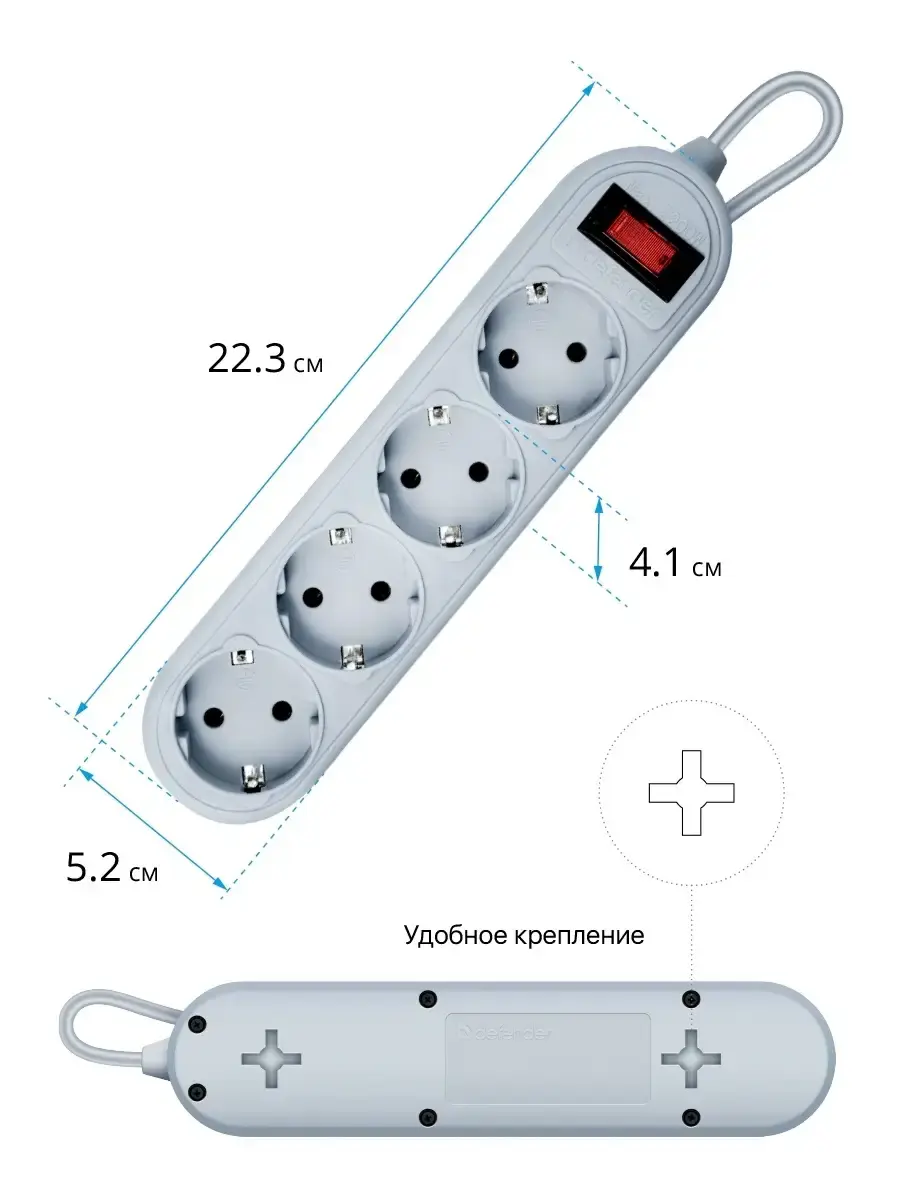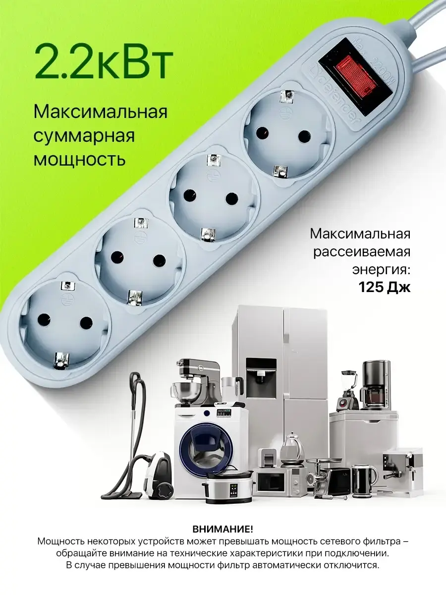 Сетевой фильтр начального уровня с четырьмя розетками, обеспечивающий все базовые функции защиты электротехники: Удлинитель имеет 4 розетки с заземлением. Автоматический предохранитель, встроенный в выключатель. Рекомендуется посчитать потребляемую мощность всех подключаемых устройств. Важно чтобы она не превышала заявленные значения в 2.2кВт. Защита от импульсных помех. Защита от перегрузки и короткого замыкания. Индикатор сети. Крепление на стену. Проводники из чистой меди. Корпус из негорючего пластика.