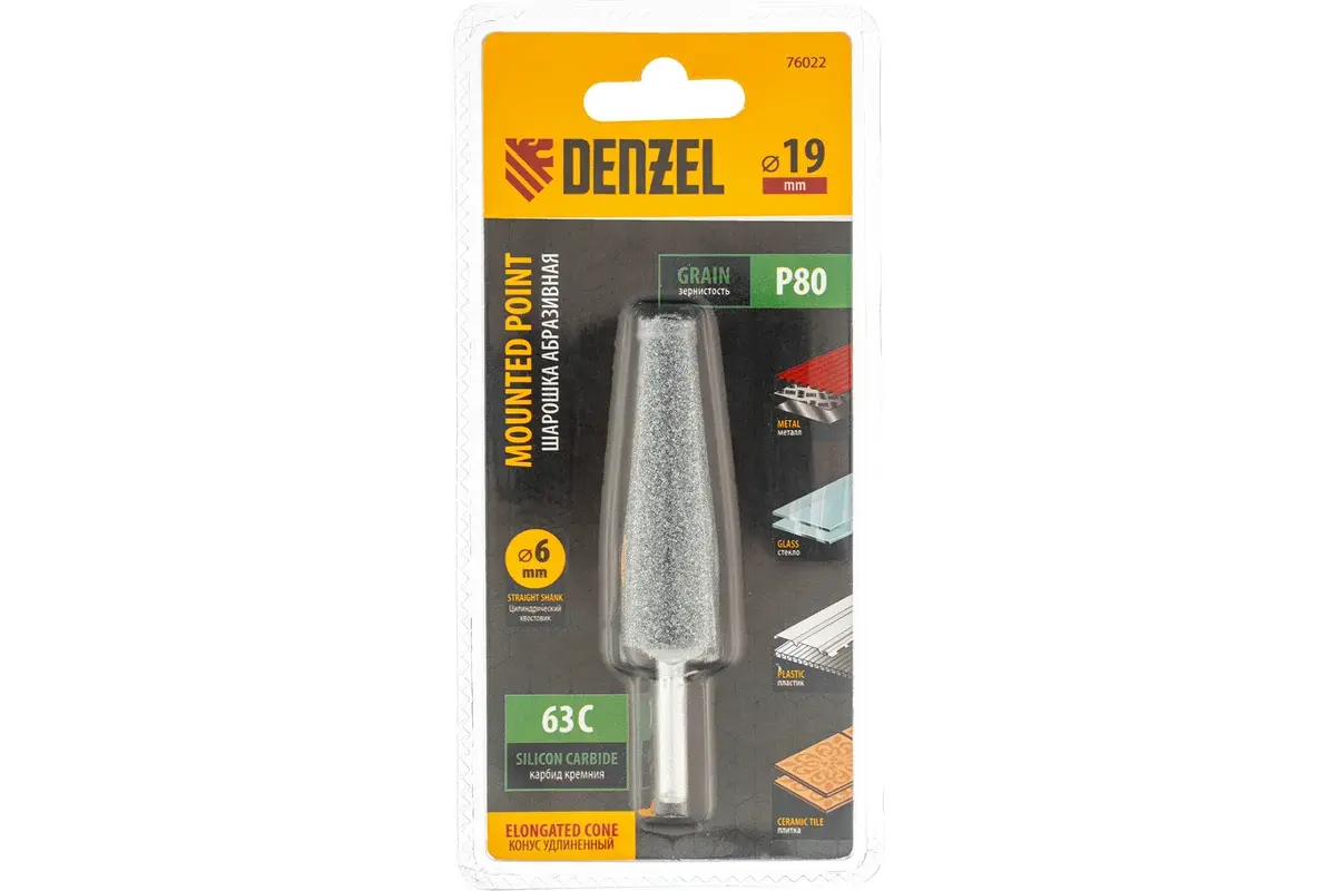 Шарошка абразивная Denzel 76022 с рабочей частью в форме удлиненного конуса 19 х 60 мм, с хвостовиком диаметром 6 мм, — оснастка для дрели, шуруповерта или прямошлифовальной машины (ПШМ). С ее помощью можно удалить заусенцы, снять фаски, очистить поверхность от ржавчины. Шарошка удобна для обработки отверстий и труднодоступных мест. Пригодится в ремонтной мастерской, автосервисе, будет полезна при выполнении отделочных работ.