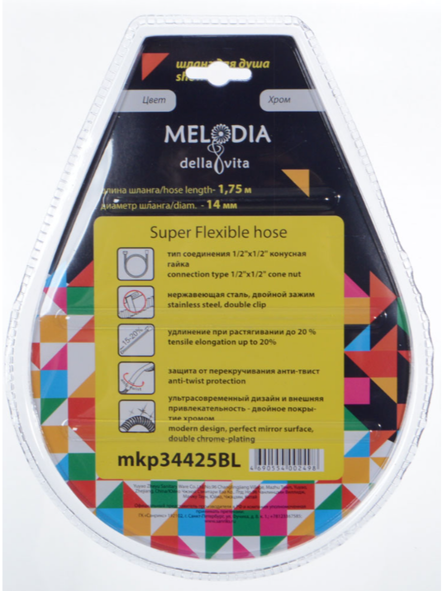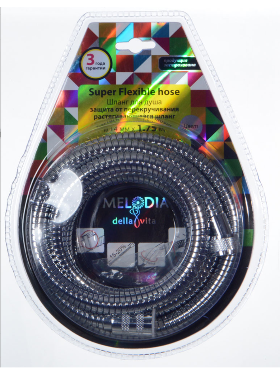 Шланг для душа MELODIA 1/2"*1/2" конус. ПВХ с оплеткой нержавеющей стали диаметром 14 мм, длинной 175 см. В серии Tubo De Lux растягивающийся шланг может увеличиваться на 15-20% от первоначальной длины, имеет двойной зажим и защиту от перекручивания. Шланг упакован в блистер. Присоединение к смесителю с помощью накидной гайки 1/2" (16 мм), присоединение лейки с помощью конусной накидной гайки 1/2" (16 мм). Шланг подходит к импортным смесителям и лейкам.