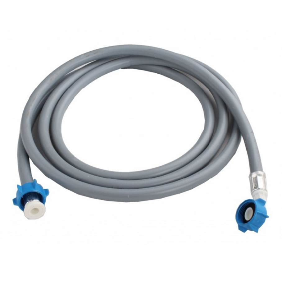 Предназначен для подключения стиральной или посудомоечной машины к системе водоснабжения. Произведён из высококачественного ПВХ. Cостоит из двух слоёв ПВХ, с армированием посередине полиэфирной нитью и выполнен согласно всем нормам производителей стиральных машин. Выдерживает давление от 20 бар до 60 бар (при испытании на разрыв), при нормативе в 10 бар, температура эксплуатации от +5°C до +25°C. Соединение шланга происходит с помощью двух фитингов: прямого и углового. Шланг комплектуется прокладками д. 3/4", сделанными из EPDM, обладающим высокой степенью устойчивости к износу и имеющий высокую стойкость к воздействиям водной среды. В комплекте идёт фильтр грубой очистки воды, поступающей в стиральную машину из системы водоснабжения.