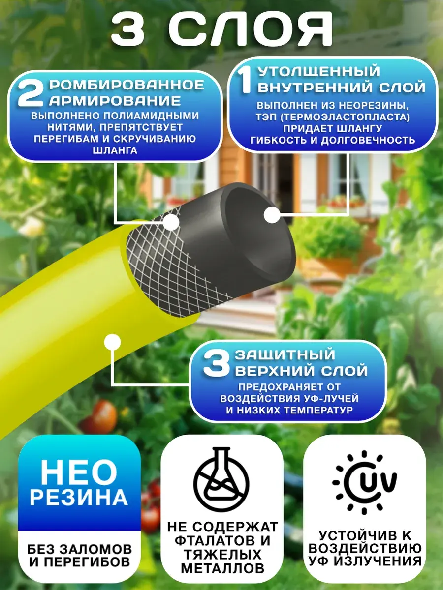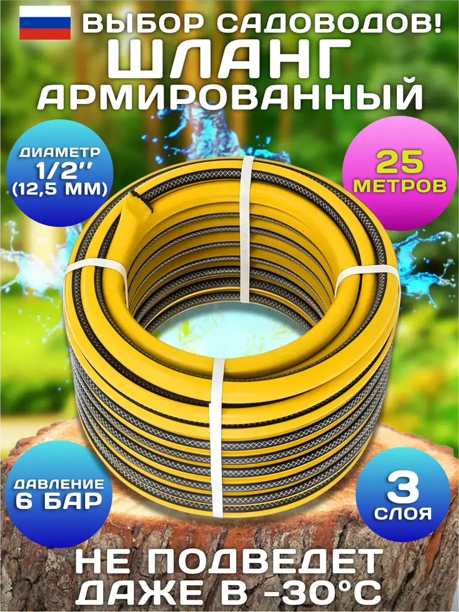 Шланг поливочный 1/2" "БОБЕР" 3-х слойный (бухта 25 метров). Диаметр: 1/2, внешний - 18,5 мм, внутренний - 12,5 мм, толщина стенок шланга 3мм. Рабочее давление: 6 АТМ. Армирован полиамидной нитью. Плетение нити: ромбовидное. Морозостойкость: до -30°C. Производство Россия. Материал - неорезина (термоэластопласт). Этот материал на ощупь похож на резину, но при этом сохраняет эластичность даже в экстремальный мороз (до -30°C по Цельсию). Не дубеет от холодной воды. Неорезина — это полимерный материал объединивший в себе эластичность каучука и прочность ПВХ, при этом лишенный их недостатков: он более легкий, не боится даже экстремального мороза, не деградирует под воздействием солнца или сухого климата. Кроме того, усилена армирующая нить, теперь она из полиамида (высокопрочного инженерного пластика). Ведь армирование - важный этап производства надежных шлангов. Морозостойкие поливочные шланги — недорогое решение для организации полива на садовом участке. Наш товар обладает всеми необходимыми характеристиками: высоким рабочим давлением, устойчивостью к скручиванию и перегибам, выдающимися параметрами морозостойкости (-30°C). Легко хранить и использовать. Он не занимает много места и не запутывается. Подходит для подключения к насосу, адаптеру или катушке. Качественная структура шланга предотвращает протечки, а возможность подключения насадки-распылителя помогает равномерно распределять поток воды. Выбирая нас, вы инвестируете в качество. Не откладывайте комфортный полив на потом – закажите качественный поливочный шланг уже сегодня!