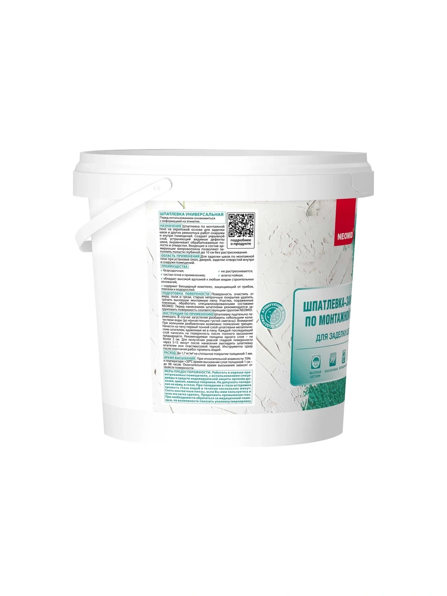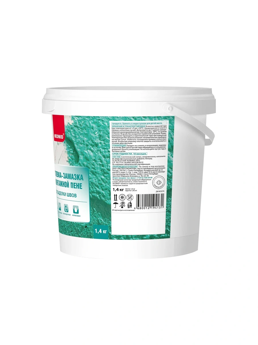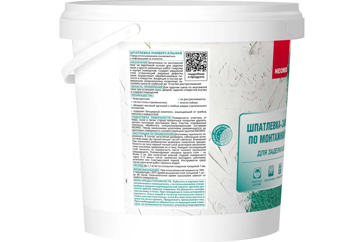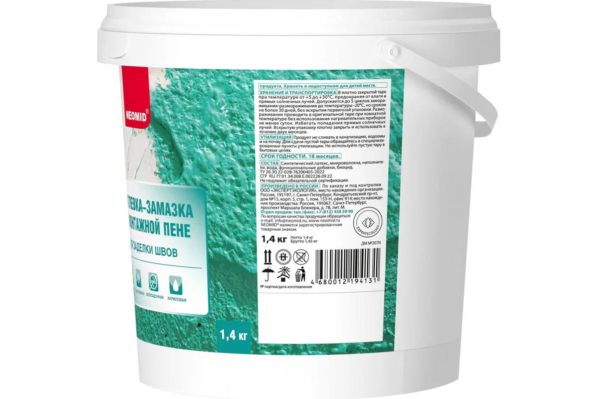 Шпатлевка по монтажной пене NEOMID 1,4 кг ЭЭ Н-Шпат-пена/1,4 безусадочная готовая к применению шпатлевка на акриловой основе предназначена для заделки швов по монтажной пене и других ремонтных работ снаружи и внутри помещений. Входящие в состав армирующие микроволокна позволяют заполнять полости глубиной до 10 см без растрескивания.