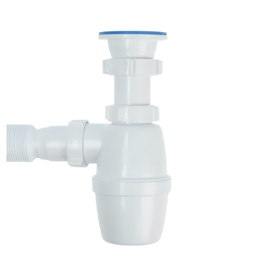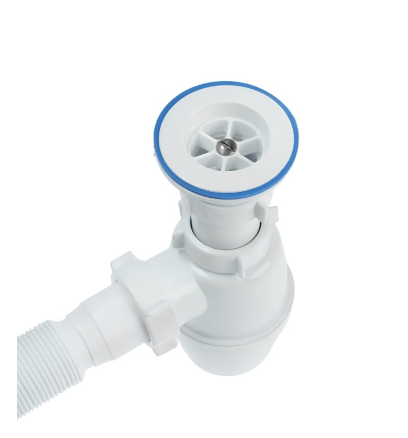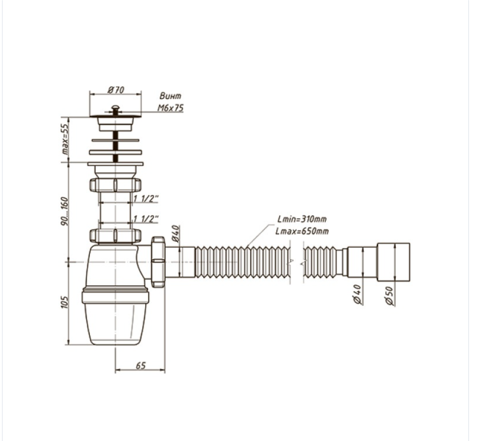 Сифон с большим корпусом и отстойником, выпуском с пластиковой чашкой д.70мм и гибкой трубой 40-40/50 для мойки. В комплекте идёт пластиковая чашка D-70мм. Сифон комплектуется нержавеющим винтом длиной 75мм и нержавеющей гайкой М6. Гибкий отвод позволяет подключить слив сифона к канализации с диаметрами 40 или 50мм.