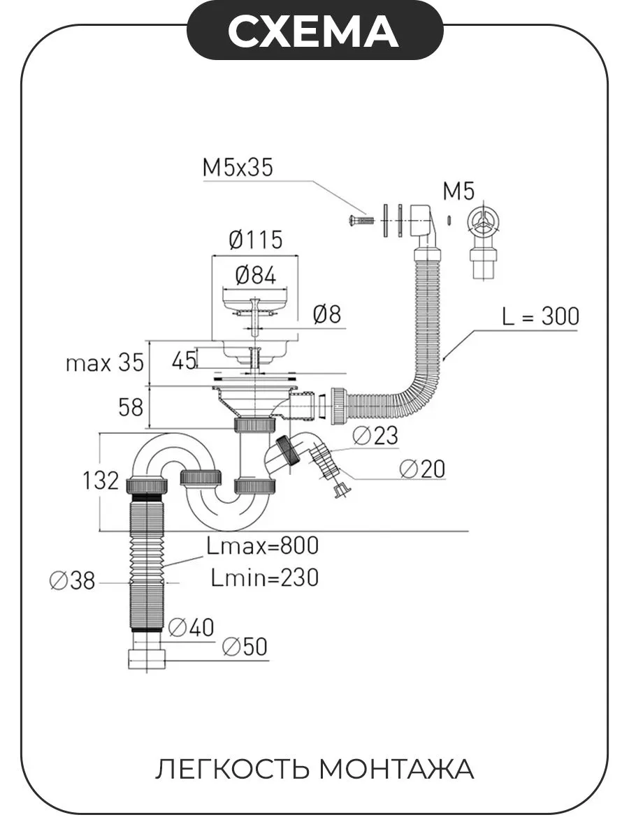 - Подходит для кухонных моек/раковин нержавеющих, керамогранитных моек с отверстием слива D 90 мм (3 ½) и переливом.