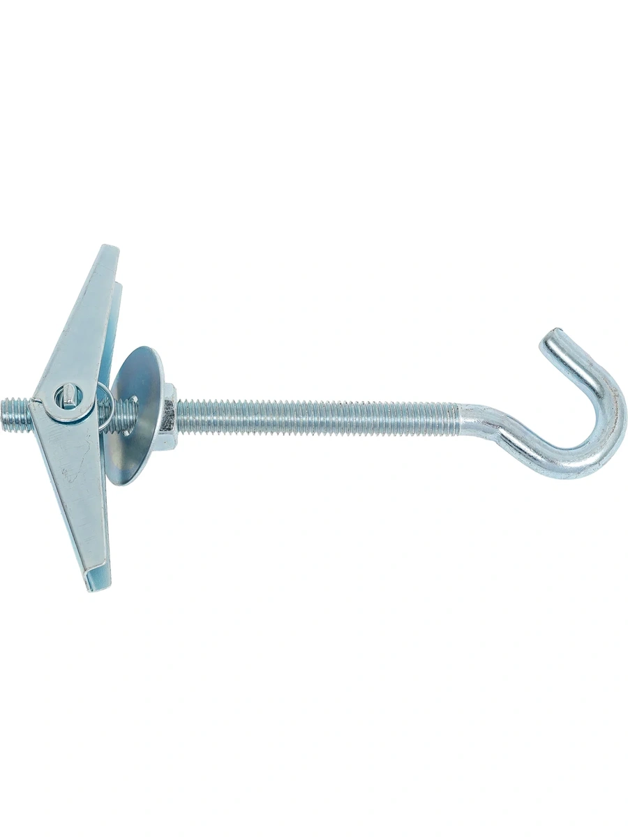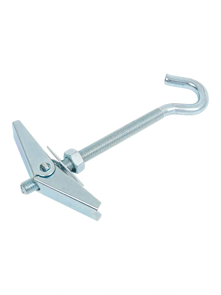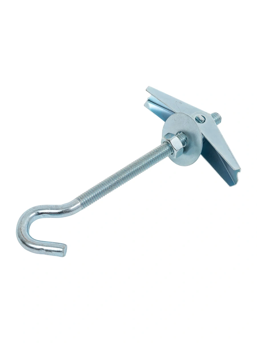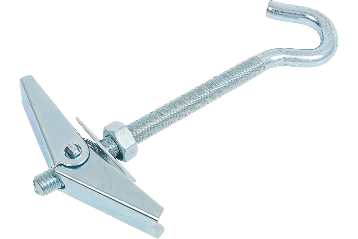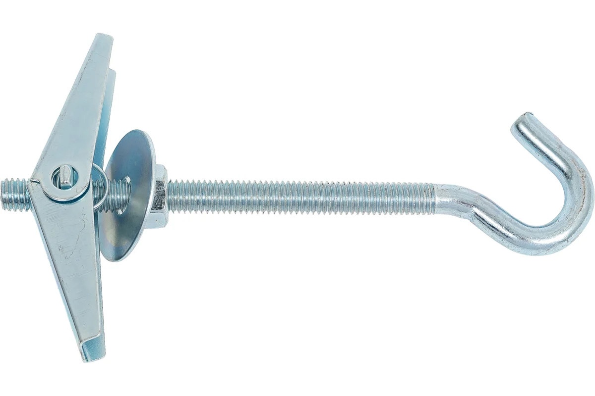 - Особенности:за счет складных металлических лопастей и пружинного механизмадюбель раскрывается за толщиной тонколистового основания. При затягивании гайки и упора вместе с ней кузовной шайбы дюбеля о лицевую поверхность материала, в котором осуществляется монтаж, образуется внешний упор со стенкой основания. Это позволяет в дальнейшем осуществить крепление различных подвесных конструкций.Не рекомендуется для применения в пустотелых кирпичных, шлакобетонных и газобетонных блоках с крупными размерами ячеек.