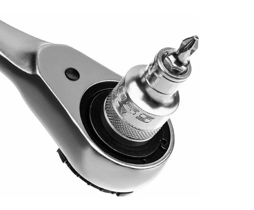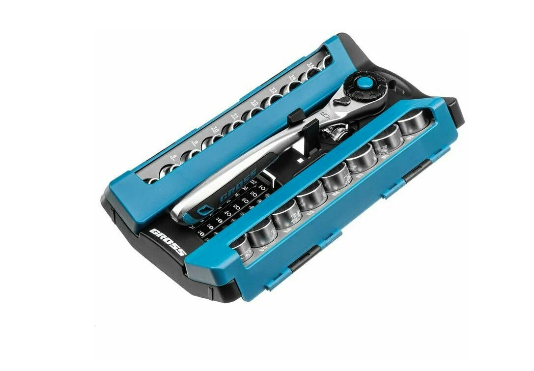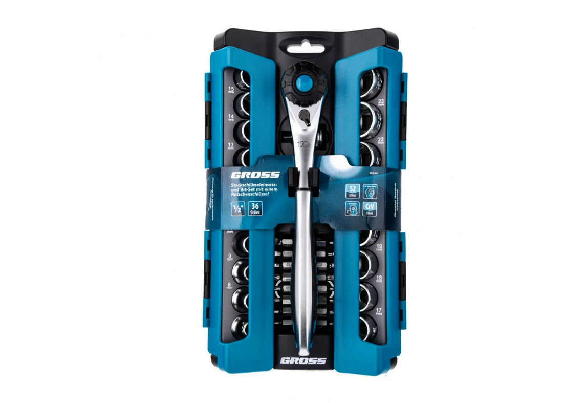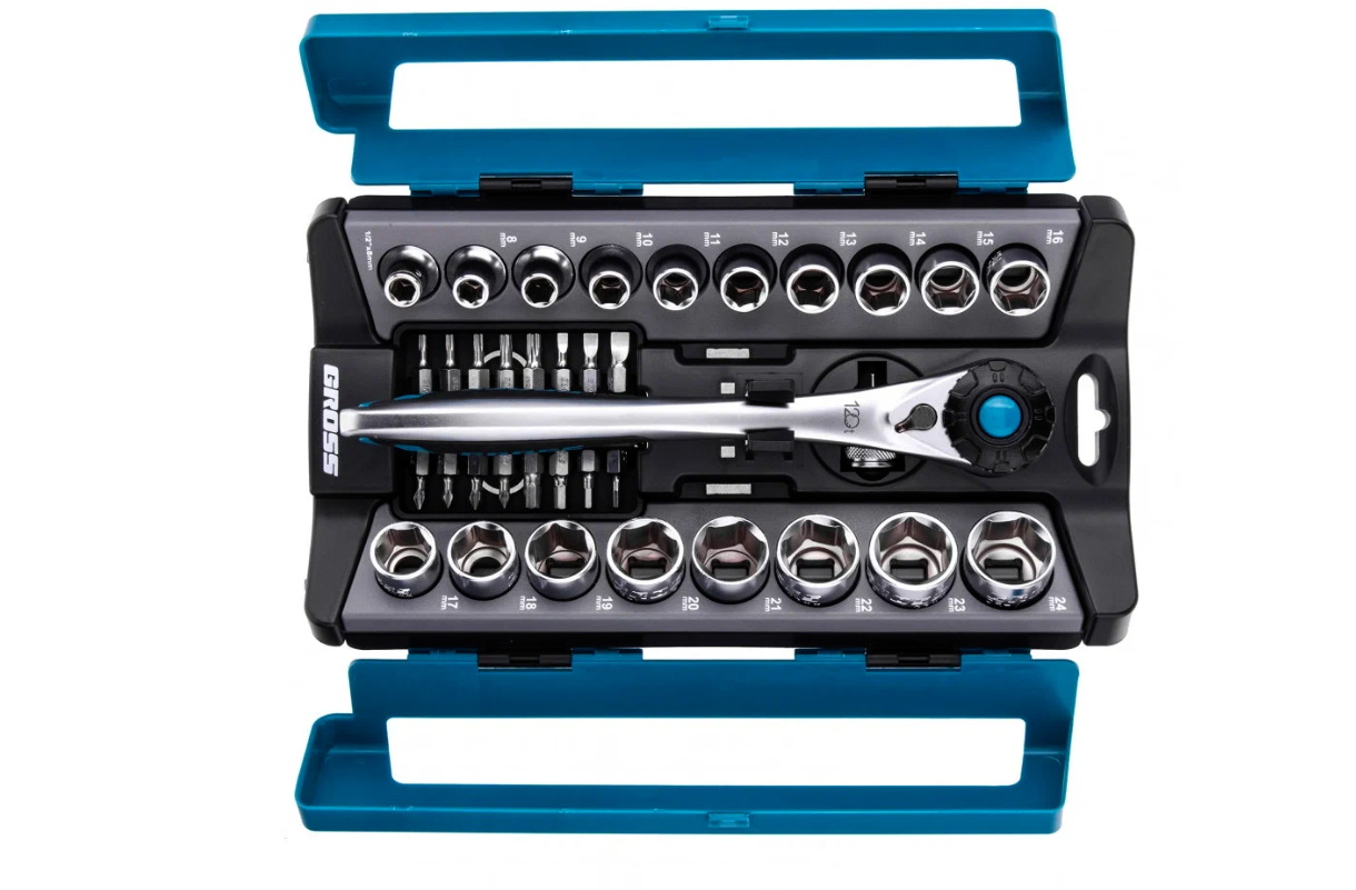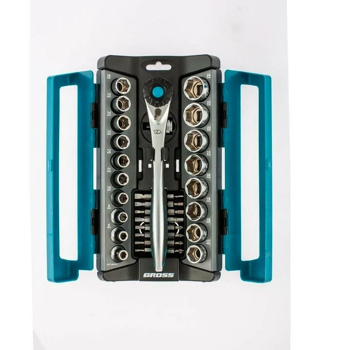 Наборы инструмента GROSS разработаны специально для автолюбителей и центров технического обслуживания. Головки и комбинированные ключи изготовлены из хромованадиевой стали, придающей инструменту исключительную твердость в сочетании с легкостью. Биты, биты-вставки и отвертки производятся из стали S2, улучшающей свойства инструмента. Набор комплектуется трещотками с реверсом и быстрым сбросом, трещоточный механизм имеет 120 зуба и обеспечивает исключительную мягкость и плавность в работе. Шаг зуба 3 град. Все наборы упакованы в кейс. Наборы инструмента GROSS пригодятся вам не только в автомобиле. С их помощью можно проводить бытовой ремонт дома и на даче, ремонт бытовых конструкций и садовой техники. Набор предназначен для слесарно-монтажных работ. Состав набора: Ключ трещоточный 1/2" Переходник 1/2" – 1/4" Адаптер для бит 5/16" - 1/2" Головки торцевые 1/2": 8, 9,10, 11, 12, 13, 14, 15, 16, 17, 18, 19, 20, 21, 22, 23, 24 мм Биты 5/16": PH1, PH2, PZ1, PZ2, SL4, SL5.5, SL7, H3, H4, H5, H6, T10, Т15, Т20, Т25, Т30.