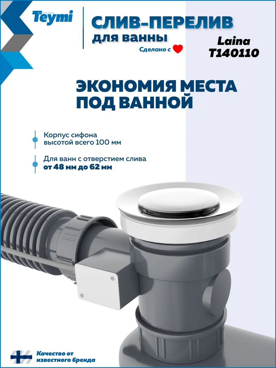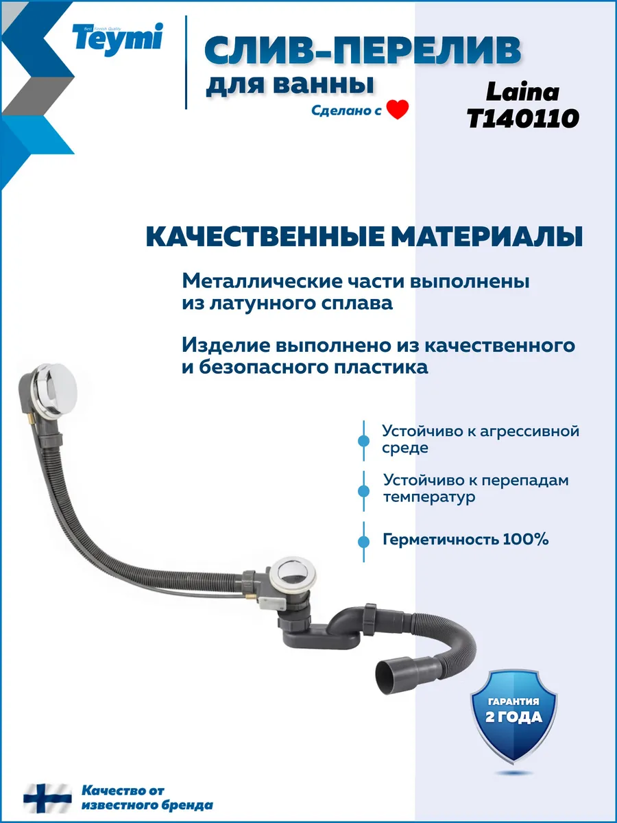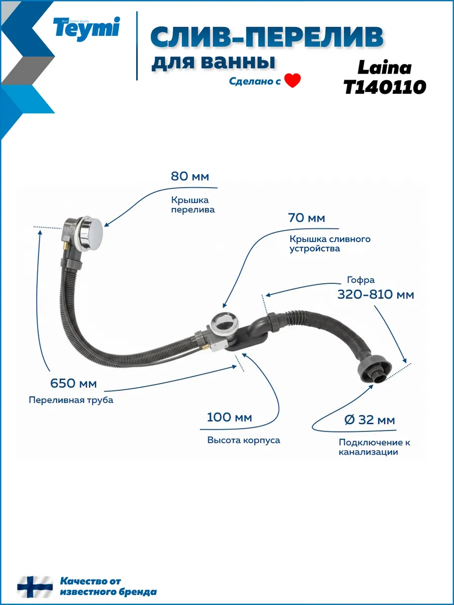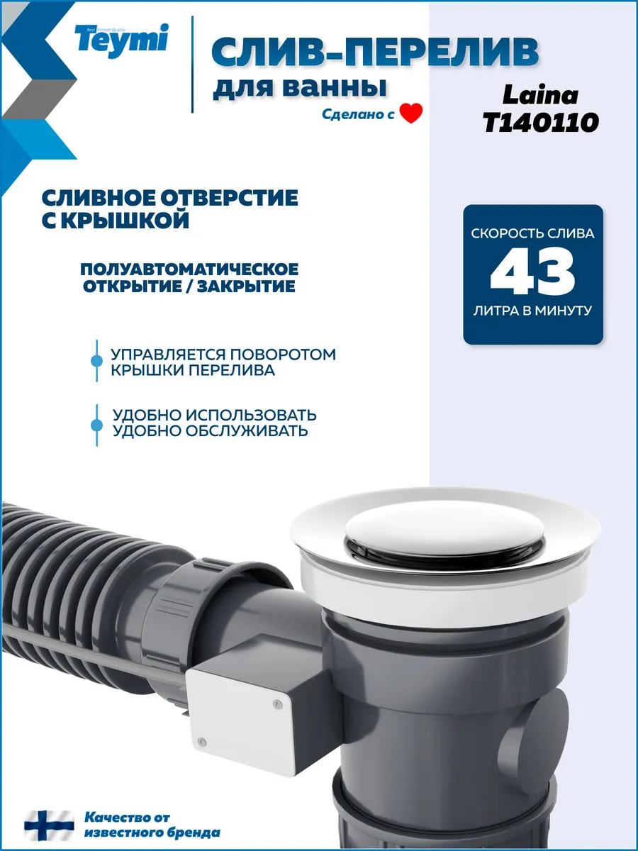 Слив-перелив для ванны полуавтомат Teymi Laina T140110 - функциональное и удобное решение для комплектации бытовой сантехники. Модель сочетает надежность, простоту эксплуатации и аккуратный внешний вид, благодаря чему подходит для большинства стандартных ванн. Полуавтоматический механизм позволяет легко открывать и закрывать слив одним легким движением — без необходимости касаться воды. Конструкция обеспечивает стабильный отвод жидкости и предотвращает переполнение благодаря встроенному переливному узлу. Изделие выполнено из прочного пластика, устойчивого к действию воды и бытовой химии. Серая хромированная фурнитура выглядит стильно и гармонично сочетается с современной сантехникой. Для удобства монтажа предусмотрены оптимальные размеры: • крышка перелива - 80 мм; • крышка клапана - 70 мм; • переливная труба - 650 мм; • гофра -320–810 мм, что позволяет адаптировать установку.