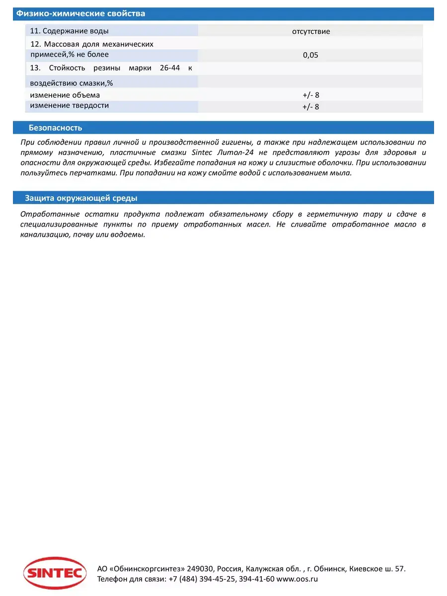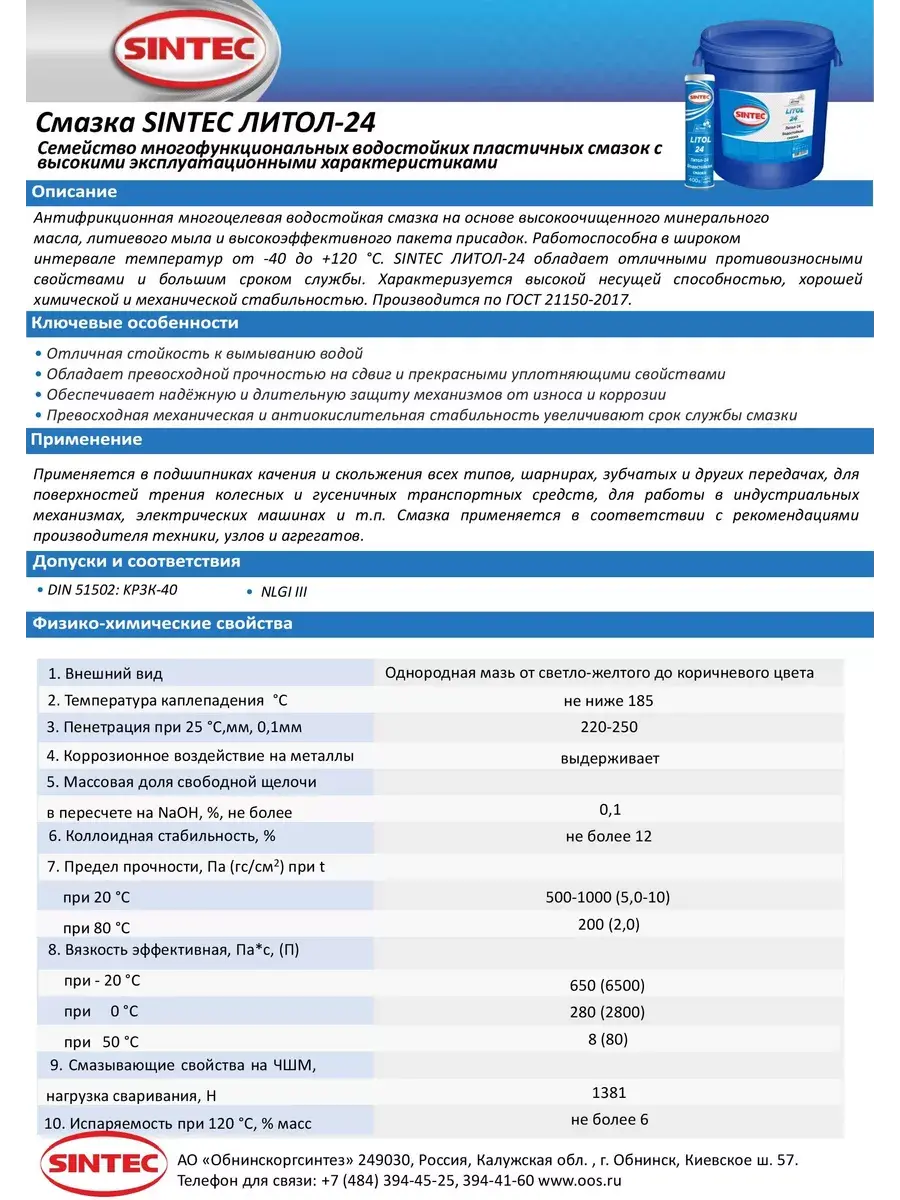 Семейство многофункциональных водостойких пластичных смазок с высокими эксплуатационными характеристиками. Антифрикционная многоцелевая водостойкая смазка на основе высокоочищенного минерального масла, литиевого мыла и высокоэффективного пакета присадок. Работоспособна в широком интервале температур от -40 до +120 °С. SINTEC ЛИТОЛ-24 обладает отличными противоизносными свойствами и большим сроком службы. Характеризуется высокой несущей способностью, хорошей химической и механической стабильностью. Производится по ГОСТ 21150-2017. Ключевые особенности Отличная стойкость к вымыванию водой Обладает превосходной прочностью на сдвиг и прекрасными уплотняющими свойствами Обеспечивает надёжную и длительную защиту механизмов от износа и коррозии Превосходная механическая и антиокислительная стабильность увеличивают срок службы смазки Применение Применяется в подшипниках качения и скольжения всех типов, шарнирах, зубчатых и других передачах, для поверхностей трения колесных и гусеничных транспортных средств, для работы в индустриальных механизмах, электрических машинах и т.п. Смазка применяется в соответствии с рекомендациями производителя техники, узлов и агрегатов. Физико-химические свойства Типичные характеристики Смазка SINTEC ЛИТОЛ 24 Внешний вид Однородная мазь от светло-желтого до коричневого цвета Температура каплепадения °С не ниже 185 Пенетрация при 25°С, мм, 0.1 мм 220-250 Коррозионное воздействие на металлы выдерживает Массовая доля свободной щелочи в пересчете на NaOH, %, не более 0,1 Коллоидная стабильность, % не более 12 Предел прочности, Па (гс/см2) при t при 20 °С, в пределах 500-1000 (5,0-10) при 80 °С, в пределах 200 (2,0) Вязкость эффективная, Па*с, (П) при — 20 °С 650 (6500) при 0 °С 280 (2800) при 50 °С 8 (80) Смазывающие свойства на ЧШМ, нагрузка сваривания, Н 1381 Испаряемость при 120°С, % масс, не более 6 Содержание воды отсутствие Массовая доля механических примесей,% не более 0,05 Стойкость резины марки 26-44 к воздействию смазки,% изменение объема