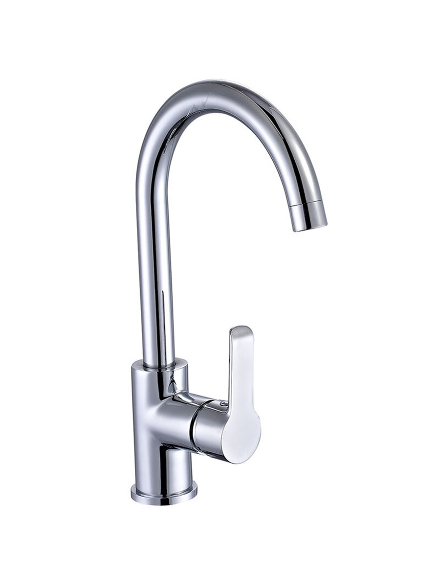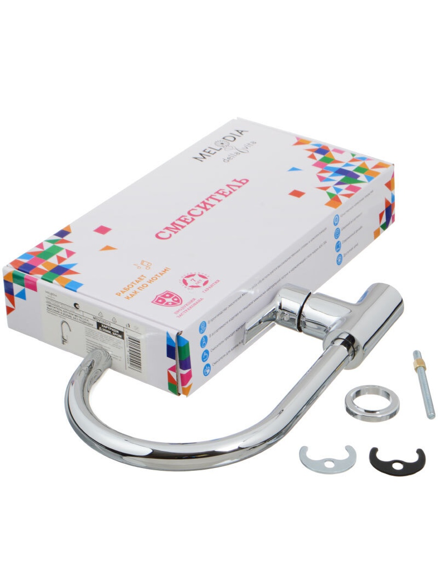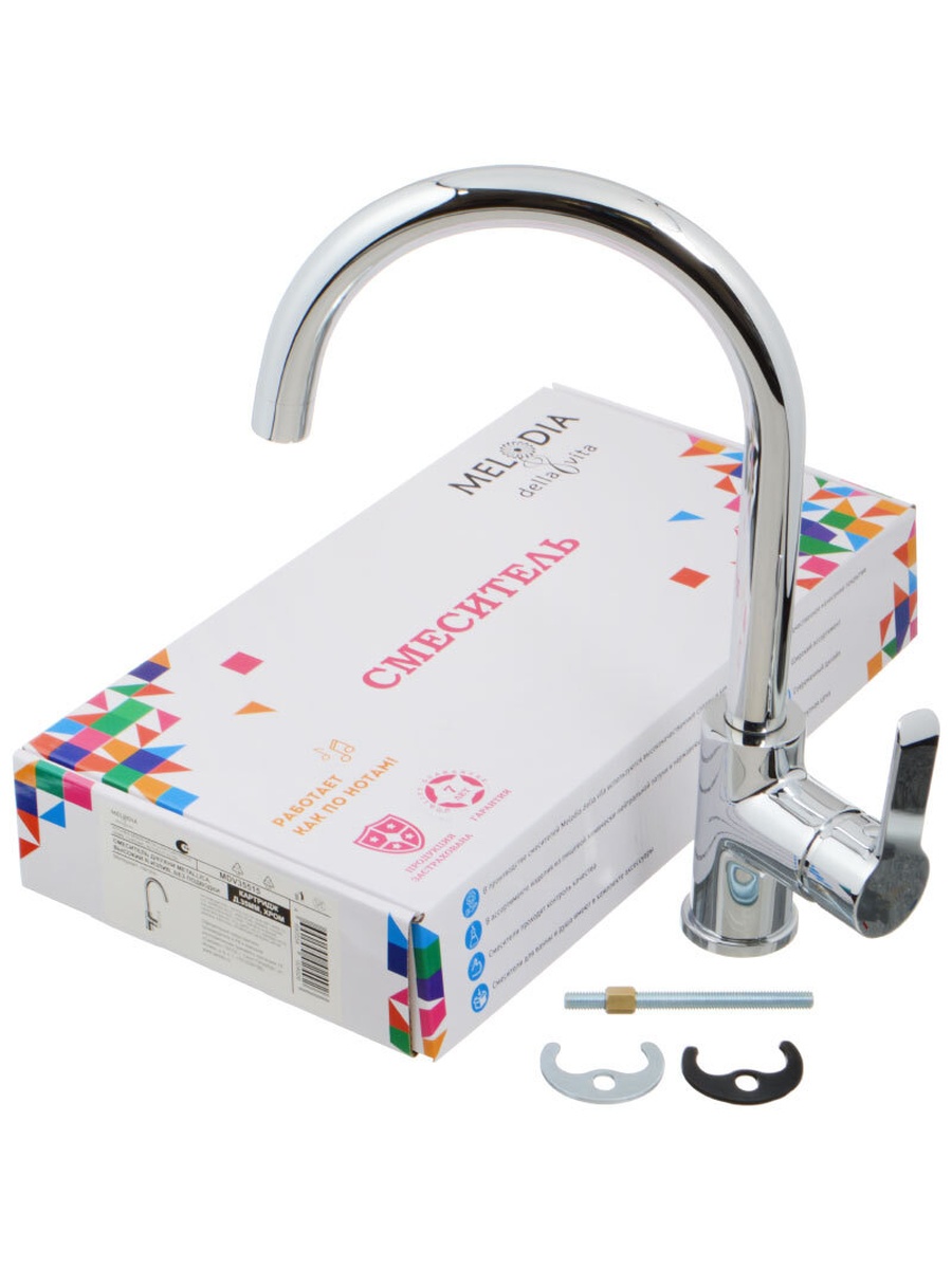 Корпус латунный хромированный, ручка цинк в цвет корпуса, картридж керамический Wanhai/Mingdi 35мм, латунная гайка картриджа, поворотный аэратор Neoperl, без гибкой подводки, латунный R-излив в цвет корпуса высокий поворотный. Крепеж: железная пластина 2,5 мм + железный винт 70 мм + латунная гайка.