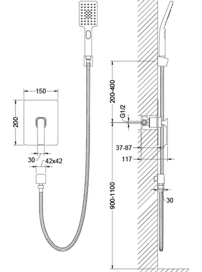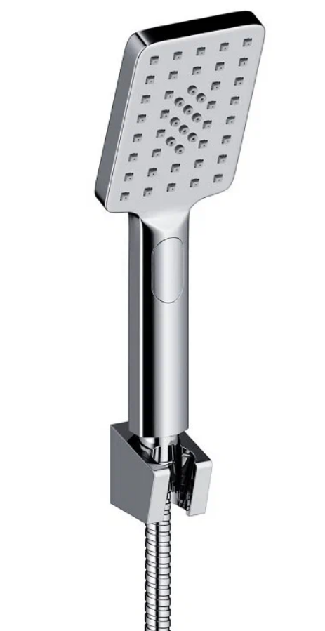 смеситель - 1 шт., декоративная накладка - 1 шт., ручка смесителя - 1 шт., ключ шестигранный - 1 шт., ручная лейка (2-х режимная, пластик) - 1 шт., шланг душа 1,5 м (латунь) - 1 шт., отвод из стены - 1 шт., держатель лейки (пластик) - 1 шт.