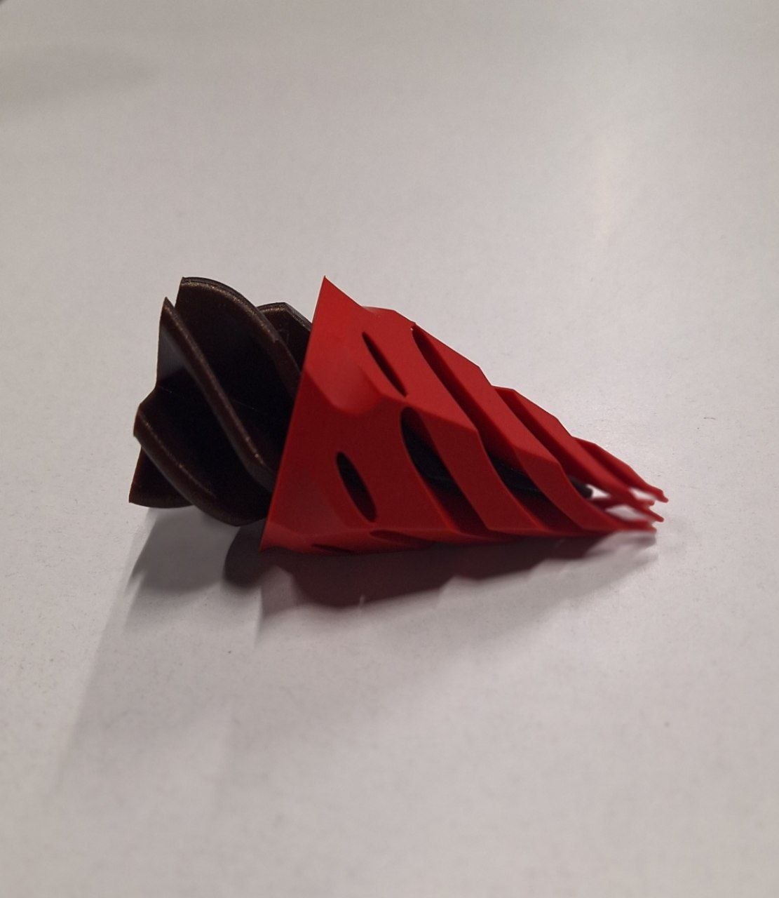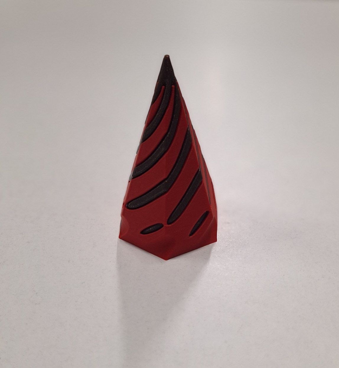 - Игрушка имеет яркий красный цвет с черными спиральными элементами, которые создают иллюзию движения. Благодаря передовым технологиям 3D-печати, каждая деталь выполнена с высокой точностью.