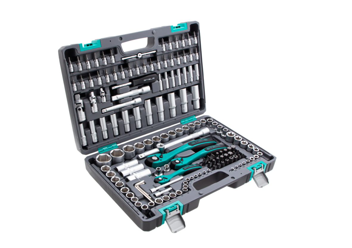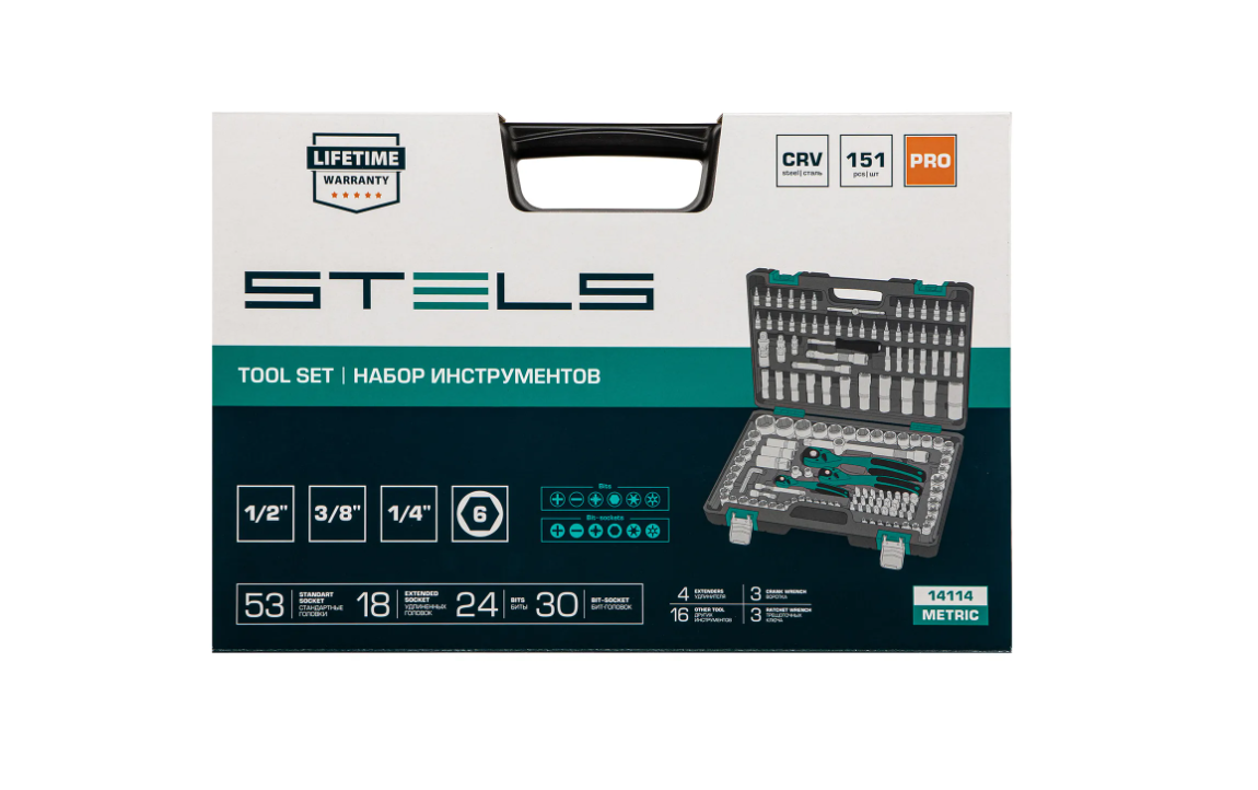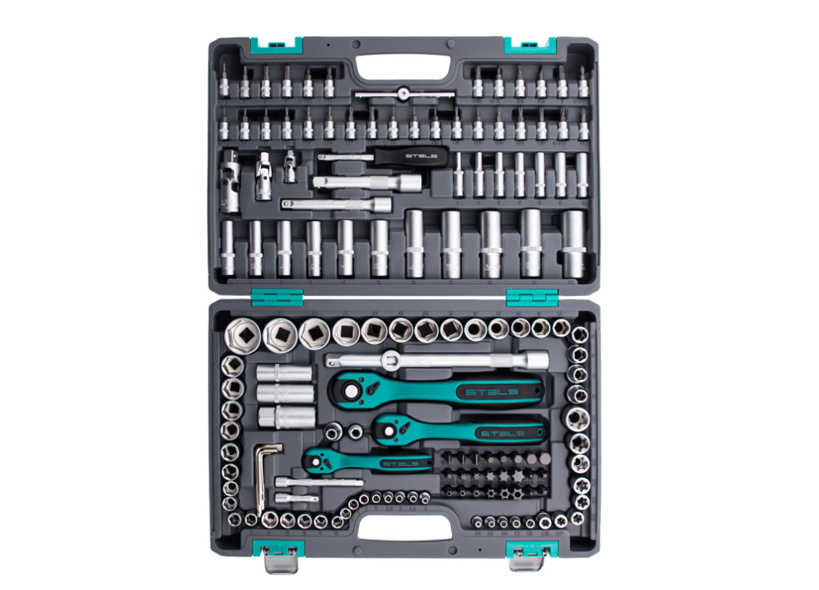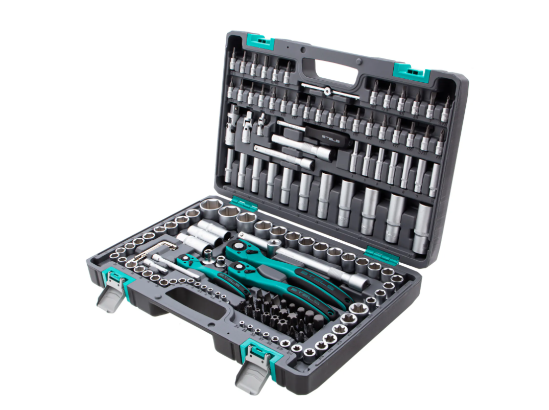 Набор инструментов Stels 14114 в ударопрочным пластиковом кейсе состоит из 151 предметов с присоединительными квадратами 1/2″ , 1/4″ и 3/8″, из стали CrV и S2, и предназначен для выполнения слесарно-монтажных работ. Включает инструменты и насадки для работы с резьбовыми крепежами, а также удлинители и т-образный вороток, облегчающие работу в труднодоступных местах. Набор предназначен для профессионального использования в автомастерской, будет полезен и для решения бытовых задач.