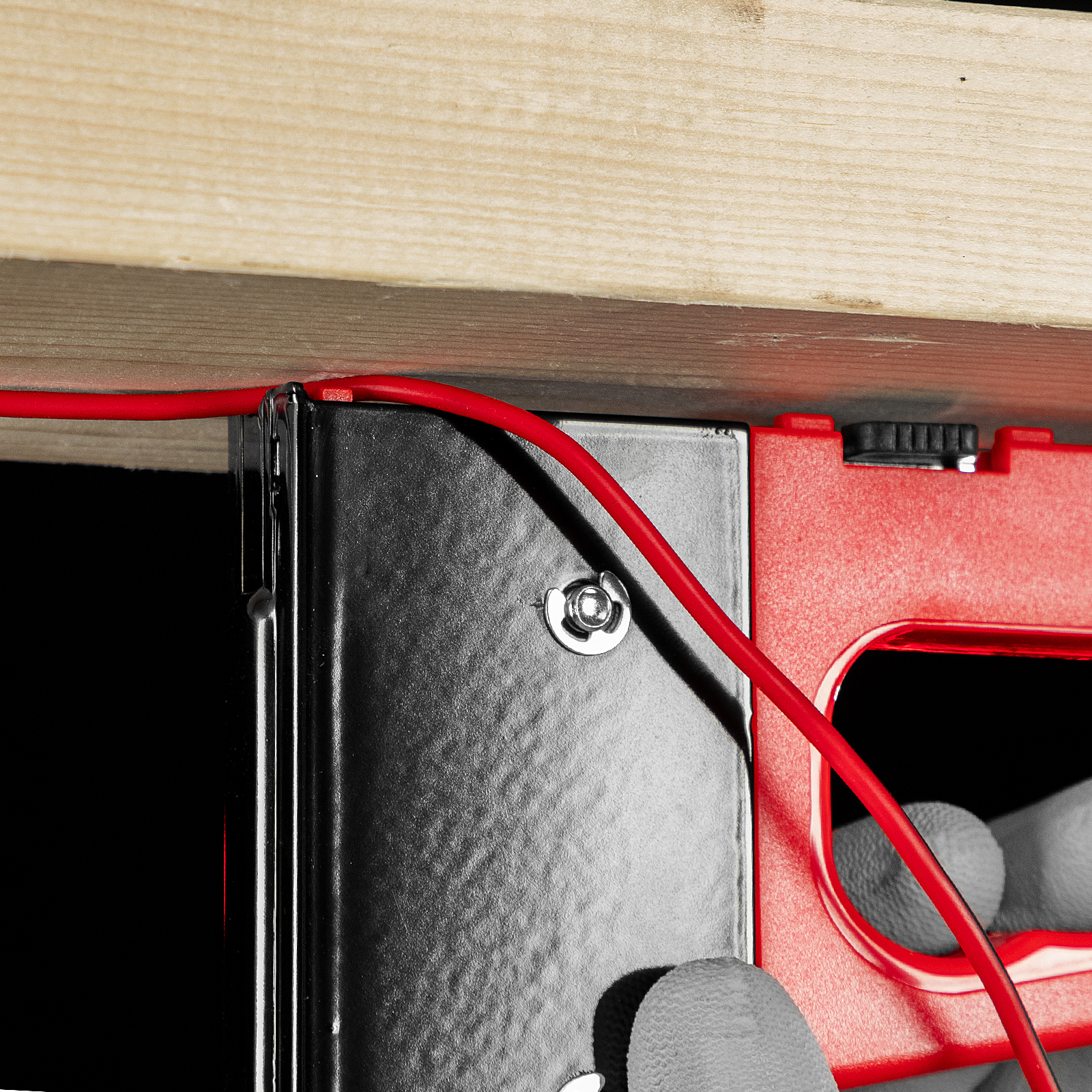 - Безопасное хранение и транспортировка — металлическая скоба фиксирует рукоятку, предотвращая случайное срабатывание степлера.