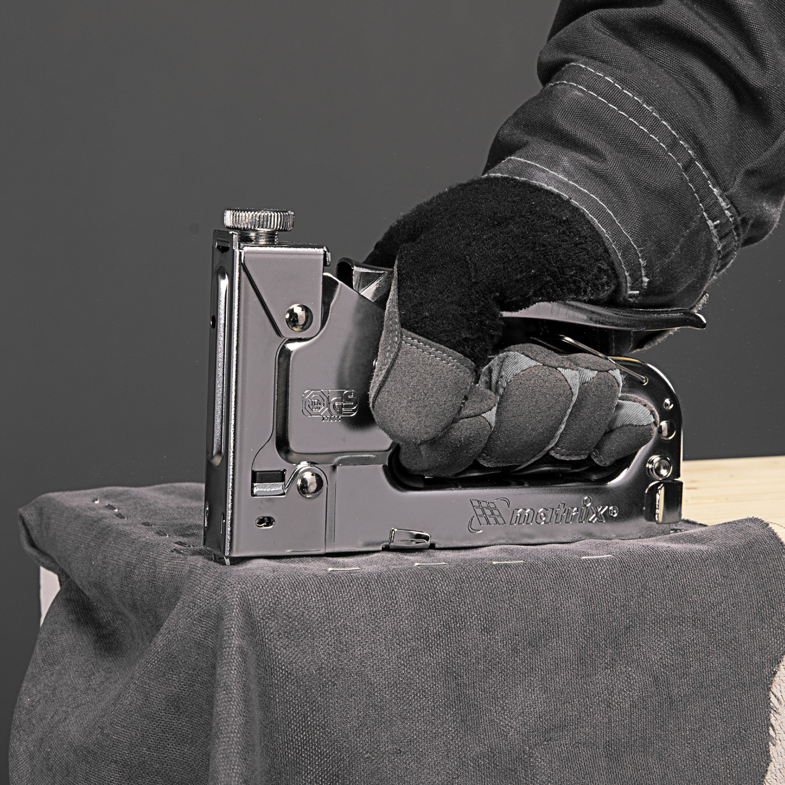 Регулируемый мебельный степлер Matrix 40902, предназначенный для скоб типа 53 размером 4-14 мм, используется для быстрого скрепления с деревянным основанием листовых материалов — фанеры, картона, оргалита, ДВП, ДСП, пленки или утеплителя. Степлер пригодится для сборки и обивки мебели, монтажа теплоизоляции, а также будет полезен в быту. Поставляется со скобами в количестве 50 штук.