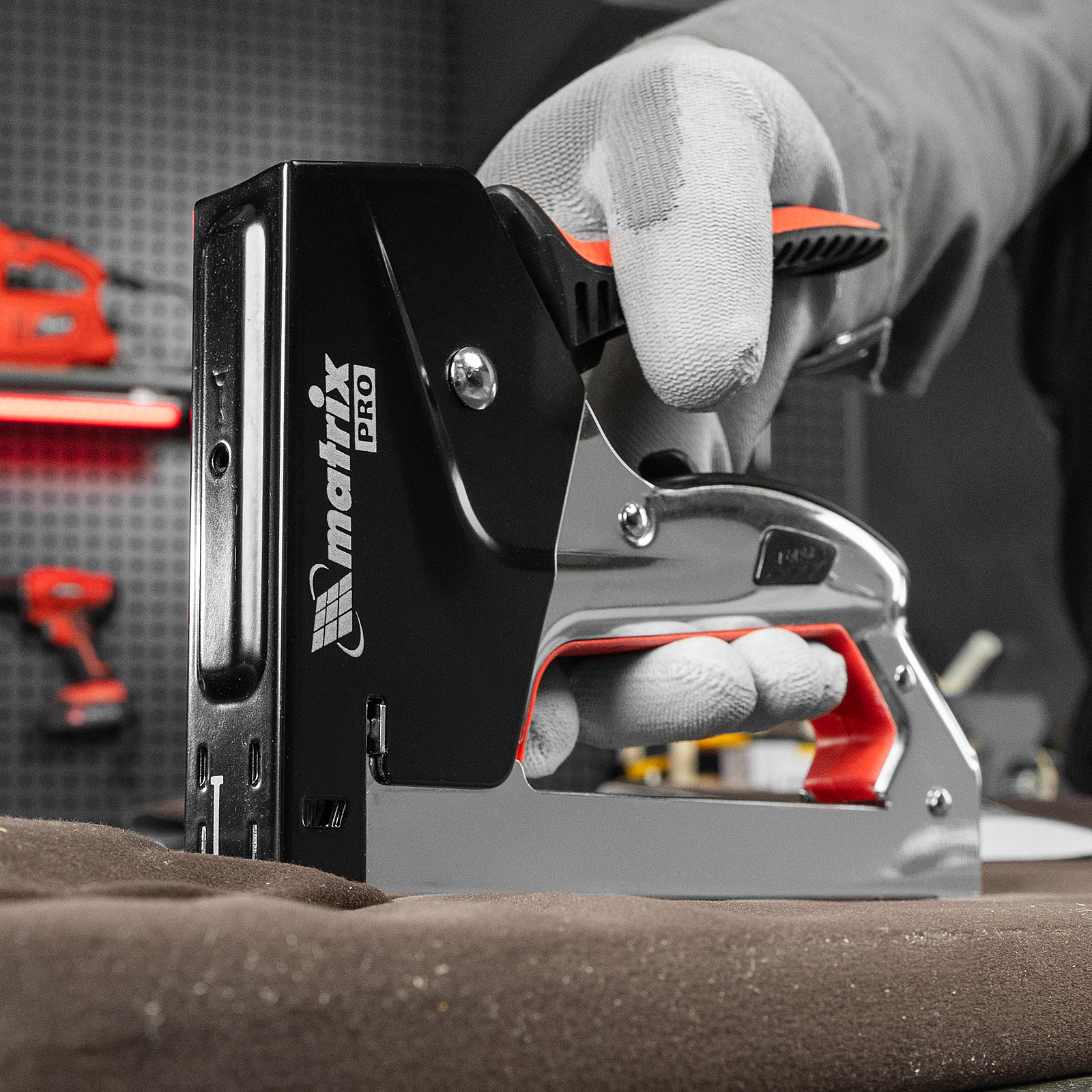 Стальной мебельный степлер Matrix PRO 40918 используется со скобами типа 53 размером 4-14 мм, 300 размером 14 мм и 500 размером 14 мм. Применяется для быстрого скрепления с деревянным основанием фанеры, оргалита, ДВП, ДСП, ПВХ-пленки или утеплителя. Инструмент подходит для сборки или обивки мебели, укладки ковровых покрытий, проведения отделочных и багетных работ.