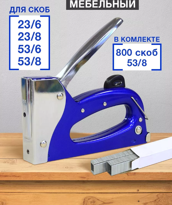 Степлер мебельный строительный предназначен для скоб 53 тип скоб и 23 тип скоб. Размер скоб 6-8 мм. В комплекте со степлером поставляется 800 скоб 53/8. Степлер строительный имеет цельнометаллический надежный корпус - степлер надежный и долговечный. У степлера мебельного надежная скобозабивная конструкция, удобный механизм загрузки скоб позволит быстро начать работу. У степлера есть петелька - компактное хранение. И есть приспособление для удаления скоб. Степлер подходит подходит для обивки мебели, подготовки теплиц к сезону, интерьерных декоративных работ, монтажныхе и отделочных работ.