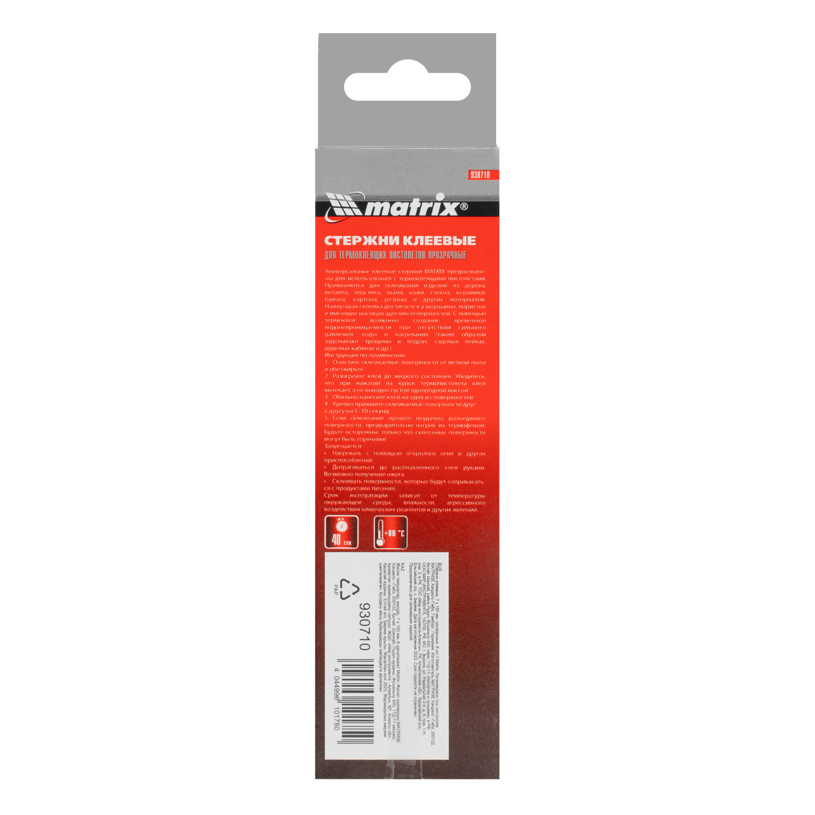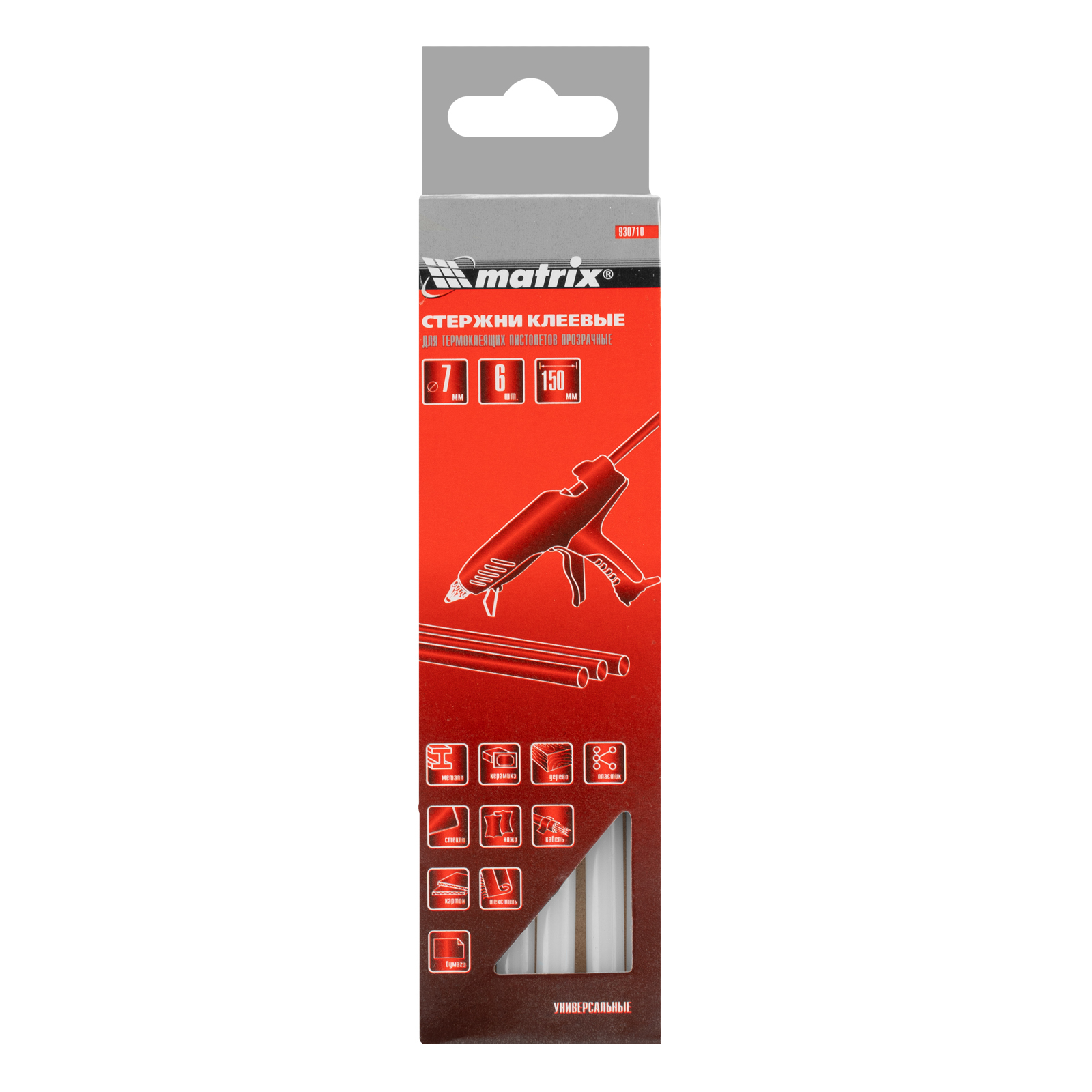 Прозрачные клеевые стержни Matrix 930710 длиной 150 мм, 6 шт. в упаковке, — расходные материалы для клеевых пистолетов калибра 7 мм. Обеспечивают надежное сцепление различных материалов: бумаги, пластика, древесины, керамики, электрических плат и т.д. Подходят также для герметизации швов и трещин.