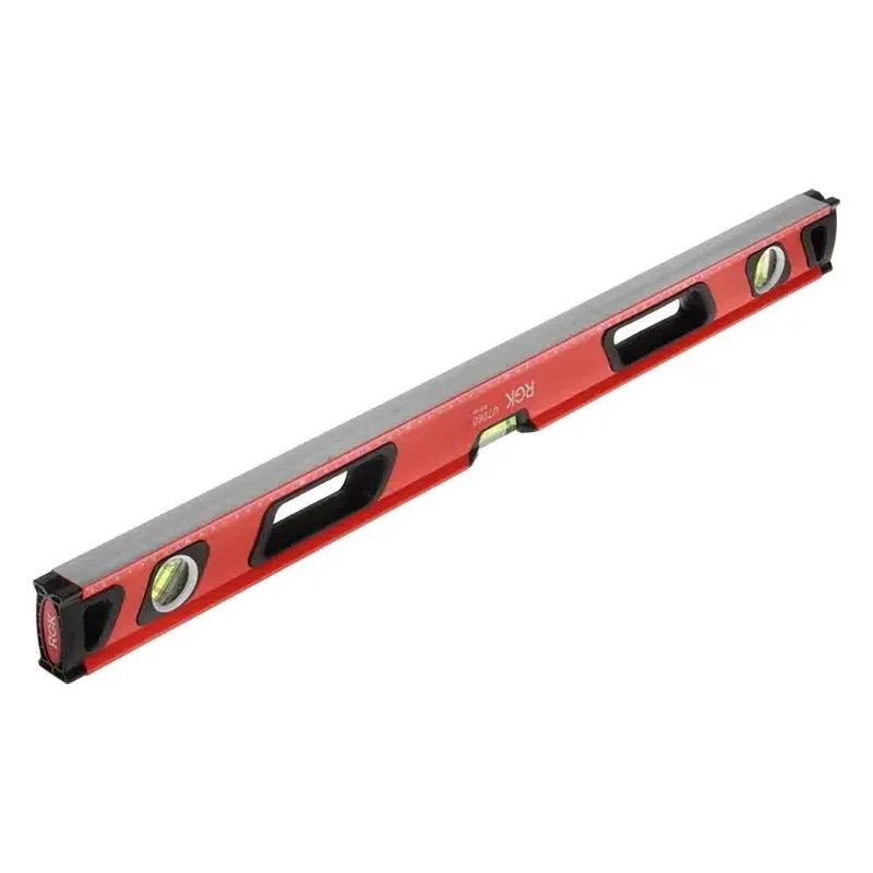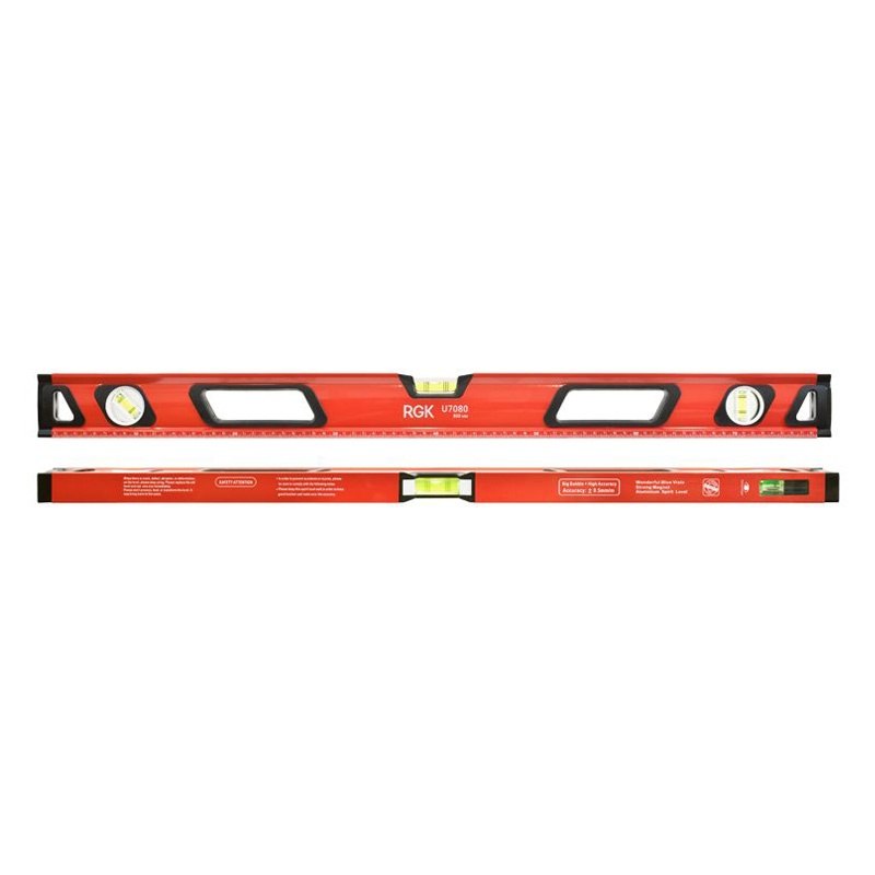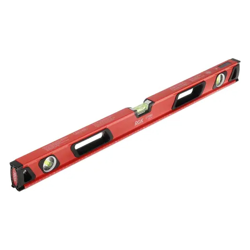 Инструмент RGK U7080 оснащен прочным металлическим корпусом, устойчивым к износу и деформациям. Устройство дополнено тремя ампулами и линейкой на 80 см. Выравнивание объектов проводится в диапазоне от 0 до 360 градусов с точностью 0.5 мм/м. Уровень дополнен магнитным основанием и удобными для удержания ручками.