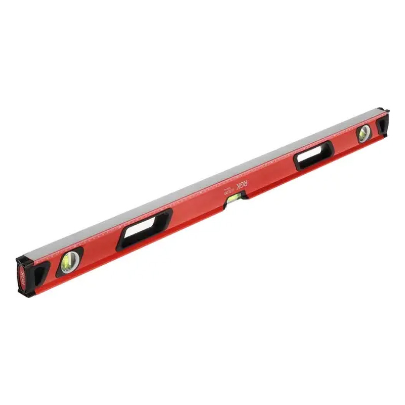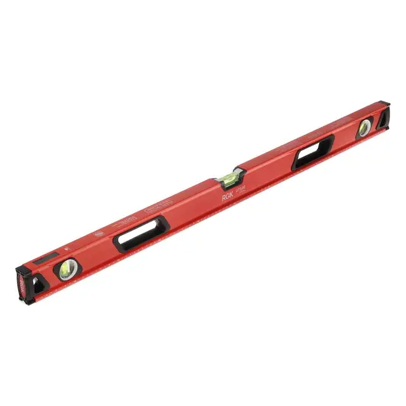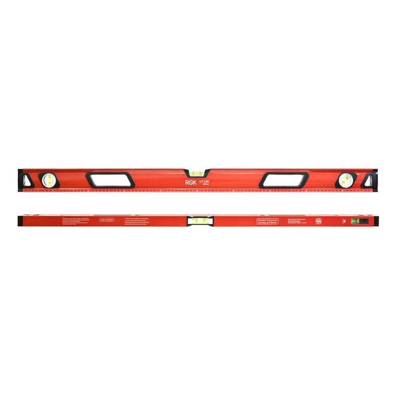 Уровень RGK U7100 представлен в износостойком и устойчивом к деформациям металлическом корпусе. Устройство оснащено тремя ампулами, расположенными вертикально и горизонтально. Инструмент дополнен линейкой на 1 метр, весит 0.97 кг, а его размеры составляют 3x7x100 см.