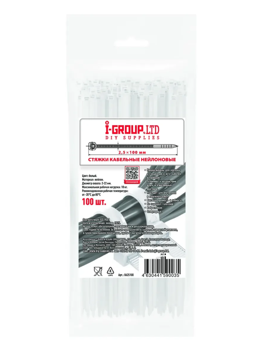 Стяжка (хомут) кабельная нейлоновая, 2,5х100 мм, белая, 100 штук, производитель I-GROUP.LTD