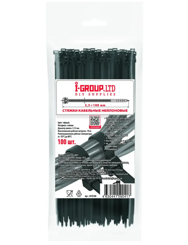 Стяжка (хомут) кабельная нейлоновая 2,5х100 мм Черная (100 шт.) производитель I-GROUP.LTD