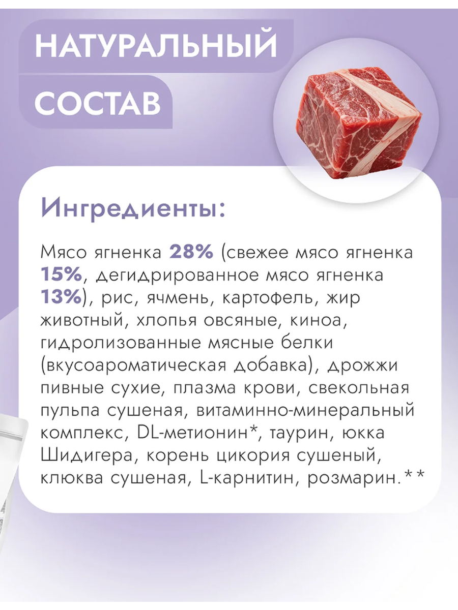 Монопротеиновый гипоаллергенный сухой корм BEST DINNER MONOPROTEIN ягненок с киноа создан специально для кошек, склонных к пищевым аллергиям и непереносимостям. Благодаря одному виду животного белка в составе, корм можно использовать как исключающий рацион. В качестве источника белка в корме используется мясо ягненка. Оно явялется гипоаллергенным и нравится разборчивым в еде кошкам. В корме нет пшеницы, кукурузы, глютена и сои, поэтому его можно рекомендовать кошкам с аллергией или неперносимостью на них. Киноа обогащает рацион флаваноидами и полифенолами, обладающими противовоспалительными и антиоксидантными свойствами, а также поддерживает здоровье ЖКТ и укрепляет иммунитет. Комплекс из пивных дрожжей, расторопши, рыбьего жира и розмарина помогает снижать воспаления и поддерживать здоровье кожи и шерсти. Умеренное содержание калорий, Dl-метионин, контроль кальция фосфора и магния обеспечивают поддержание оптимальной кондиции тела и профилактику МКБ.