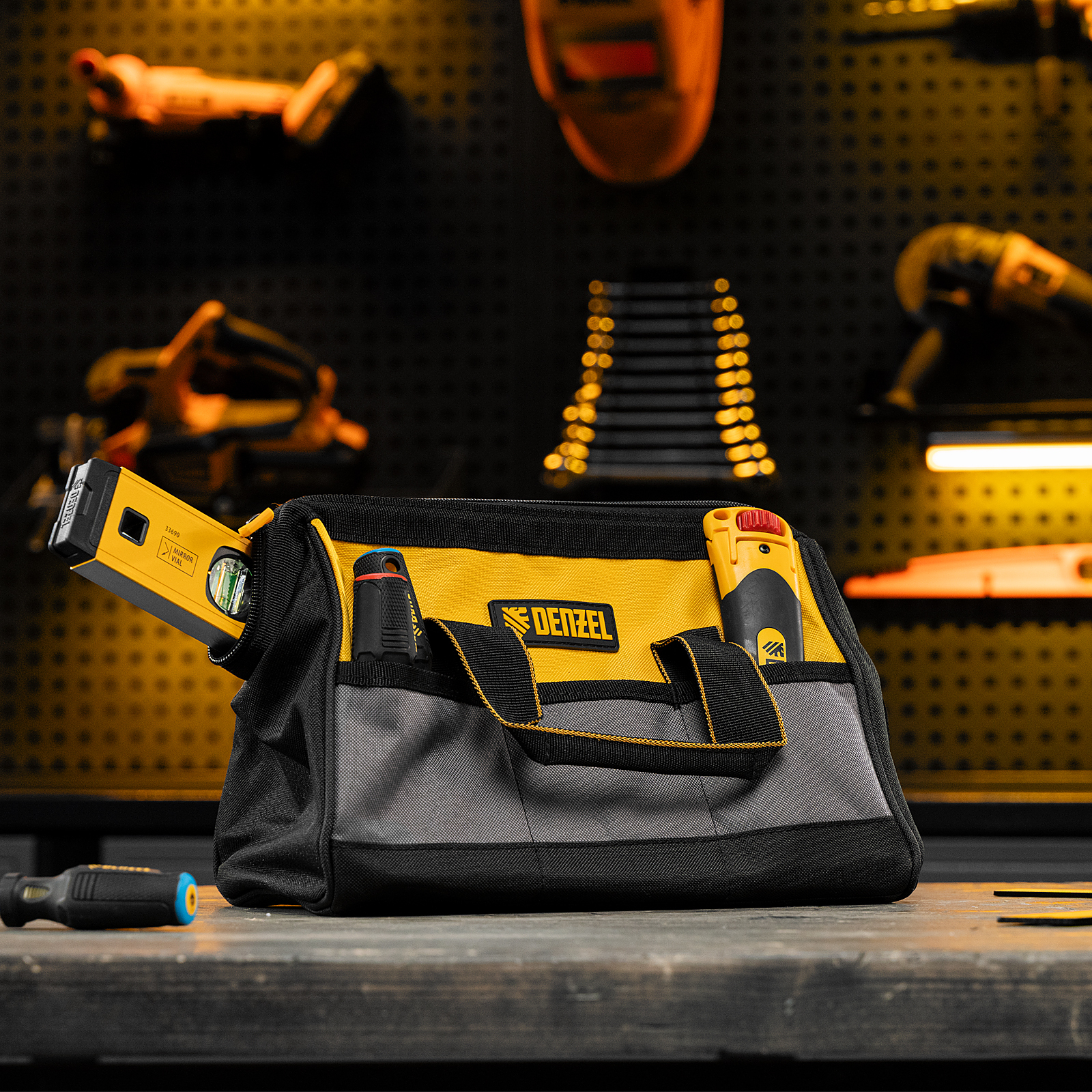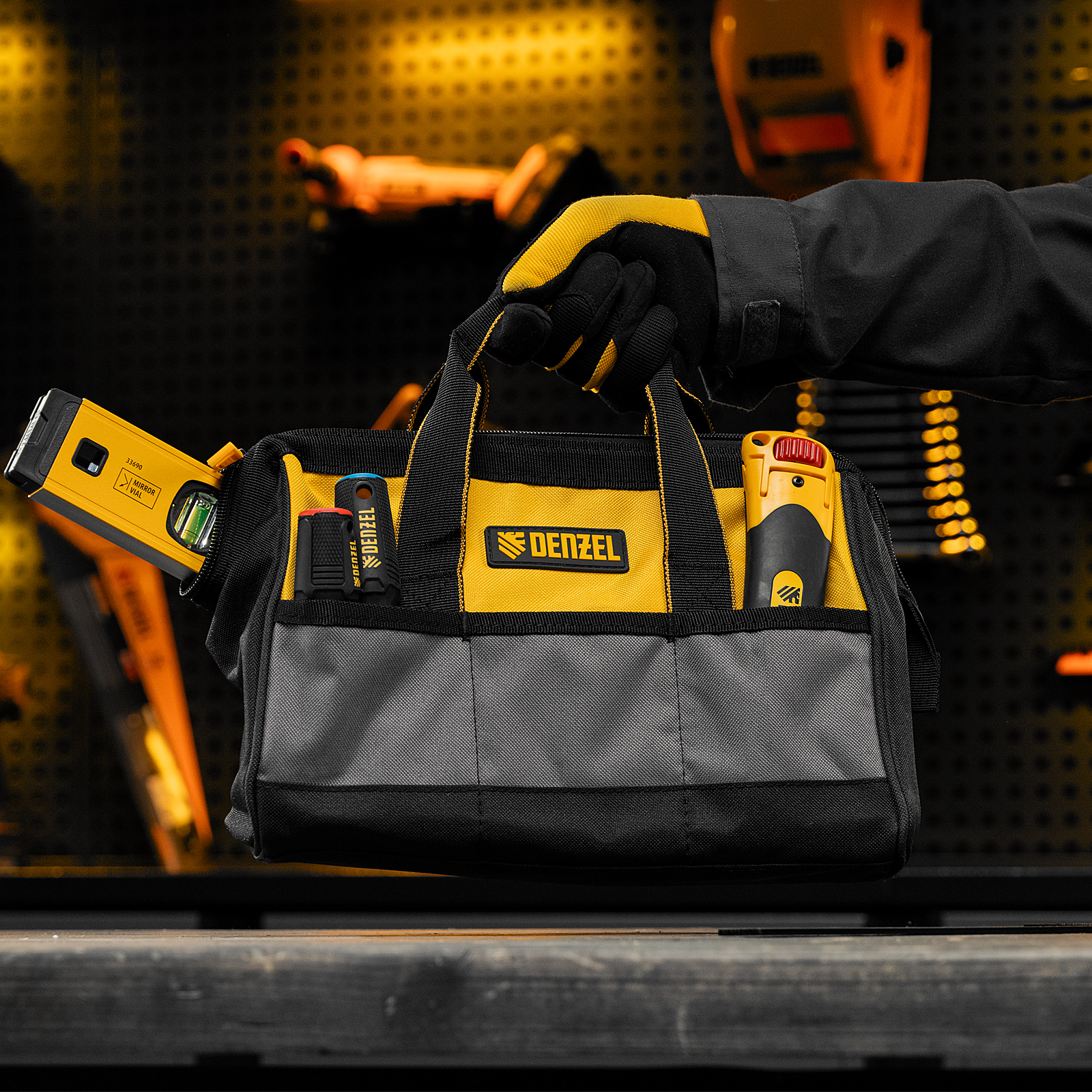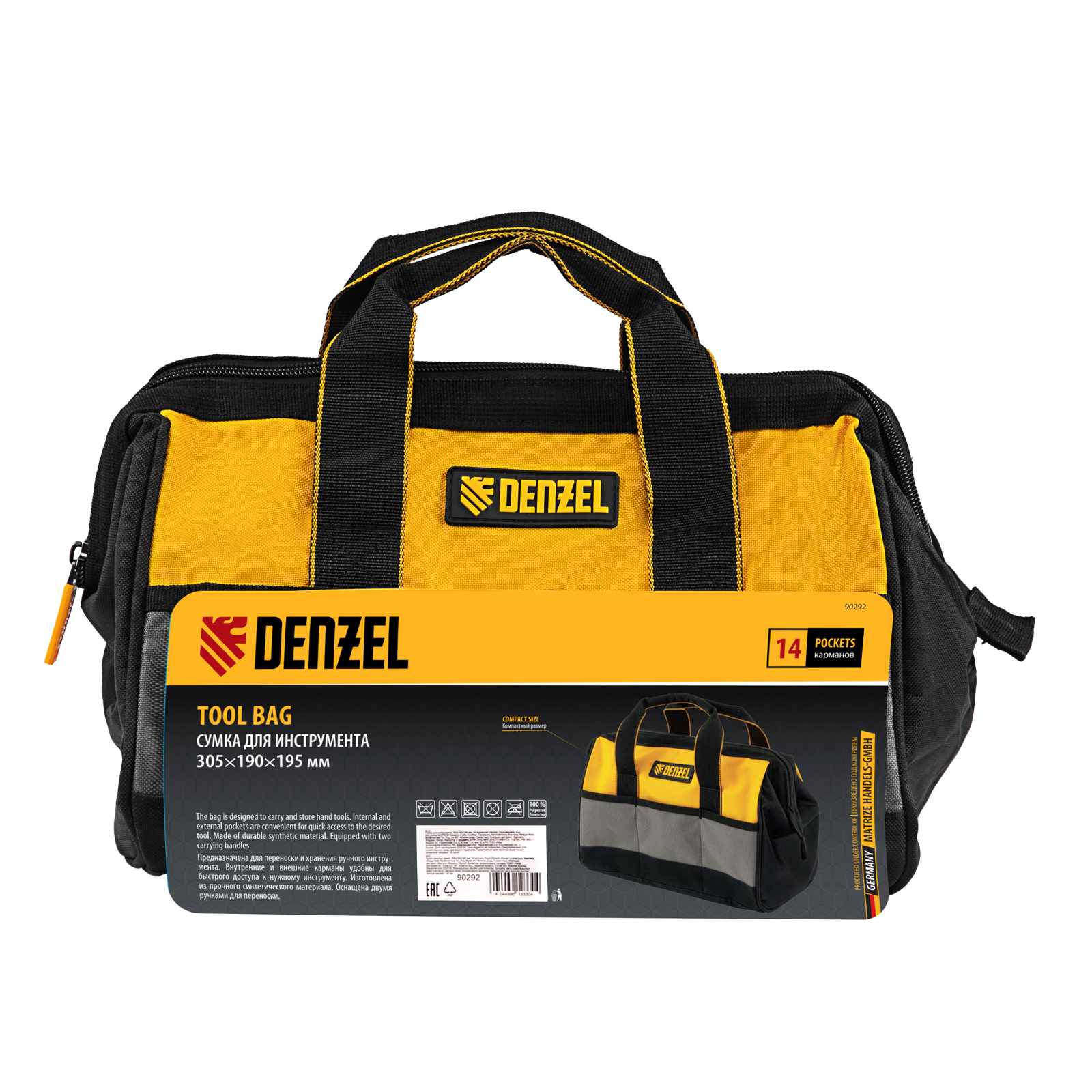 Сумка Denzel 90292 с 14 карманами, габаритами 305 х 190 х 195 мм, предназначена для хранения и транспортировки инструментов. Пригодится строителям, сантехникам, монтажникам и автовладельцам.
