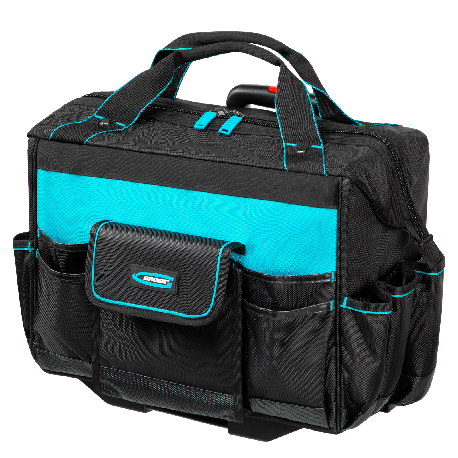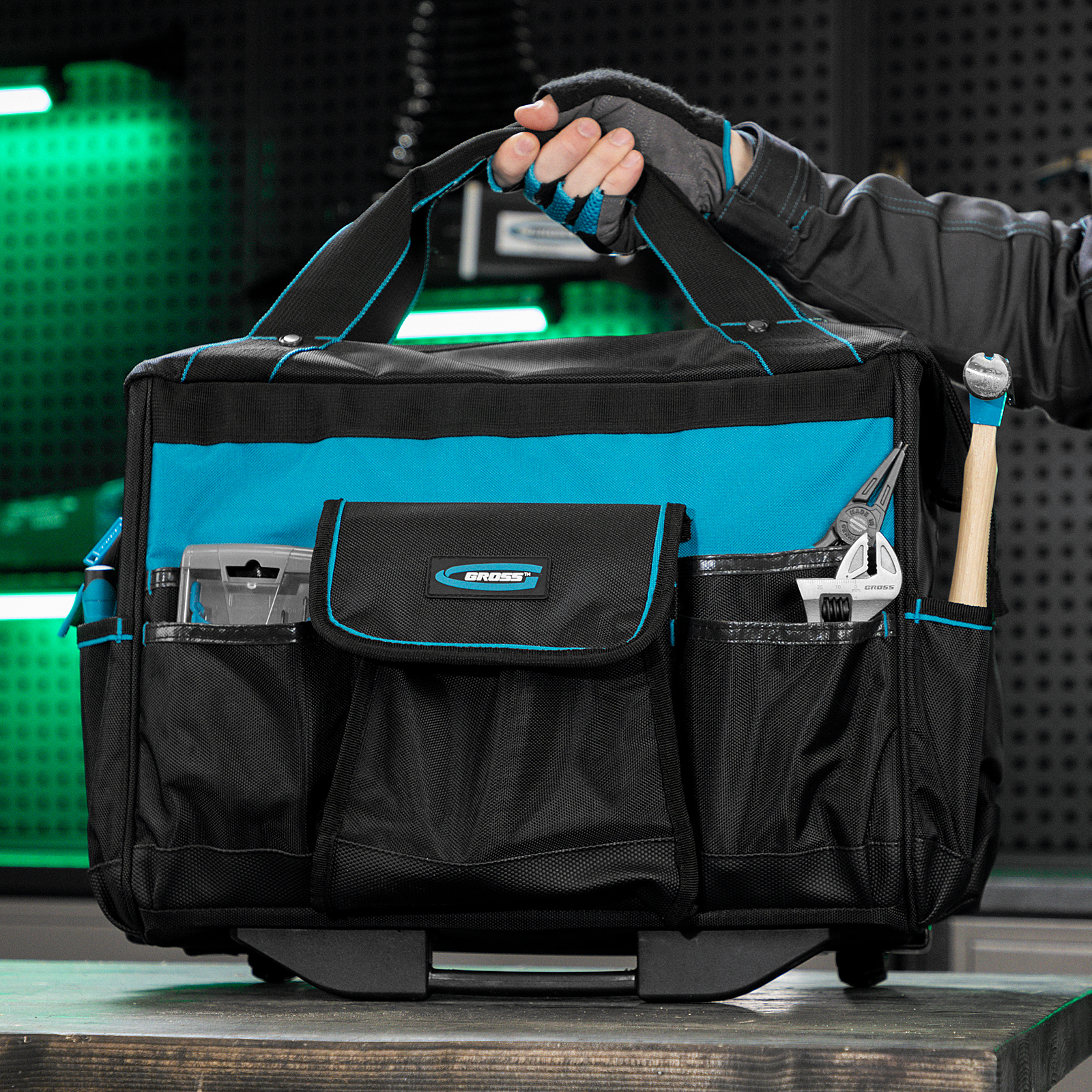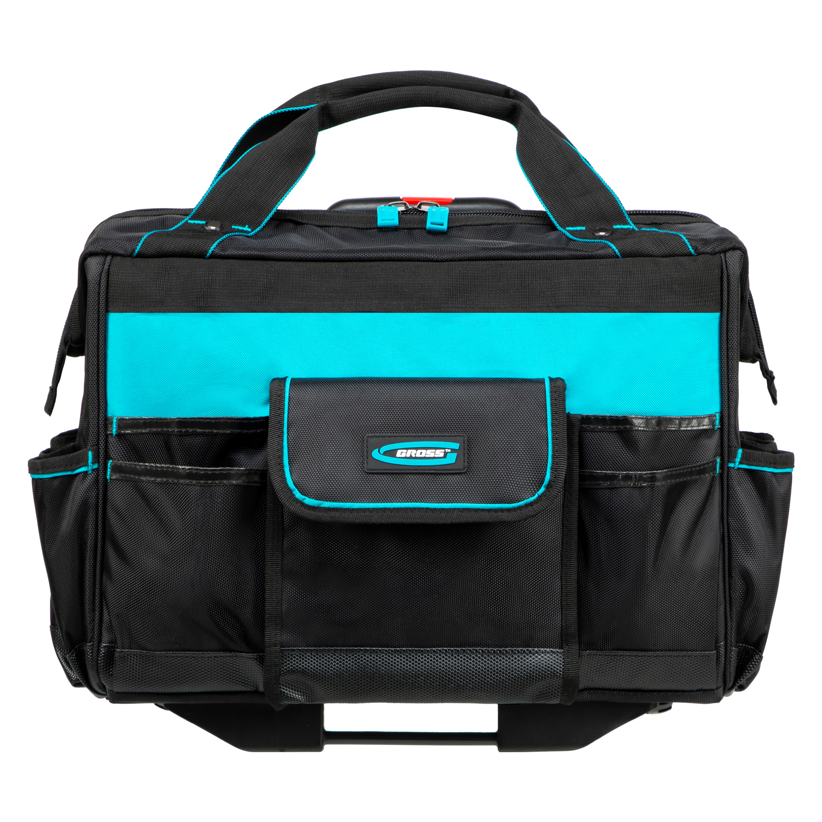 Сумка Gross 90277 размером 460 х 240 х 340 мм, с выдвижной рукояткой и колесами, имеет 18 карманов и вместительное основное отделение, в которые можно сложить необходимый ручной и электроинструмент. Сумка пригодится дома, в гараже и в поездке.