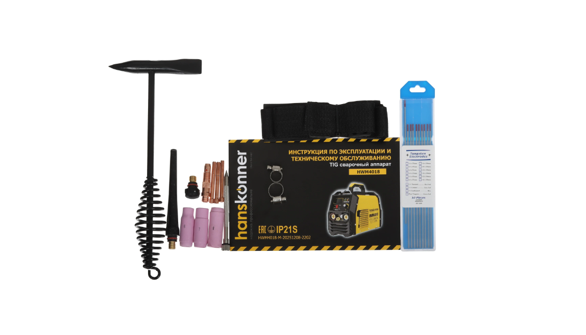 КомплектацияTIG горелка 4м, воздушный шланг, вольфрамовый электрод, зажим шланга 2 шт, клемма «массы» с кабелем 2м, ещё