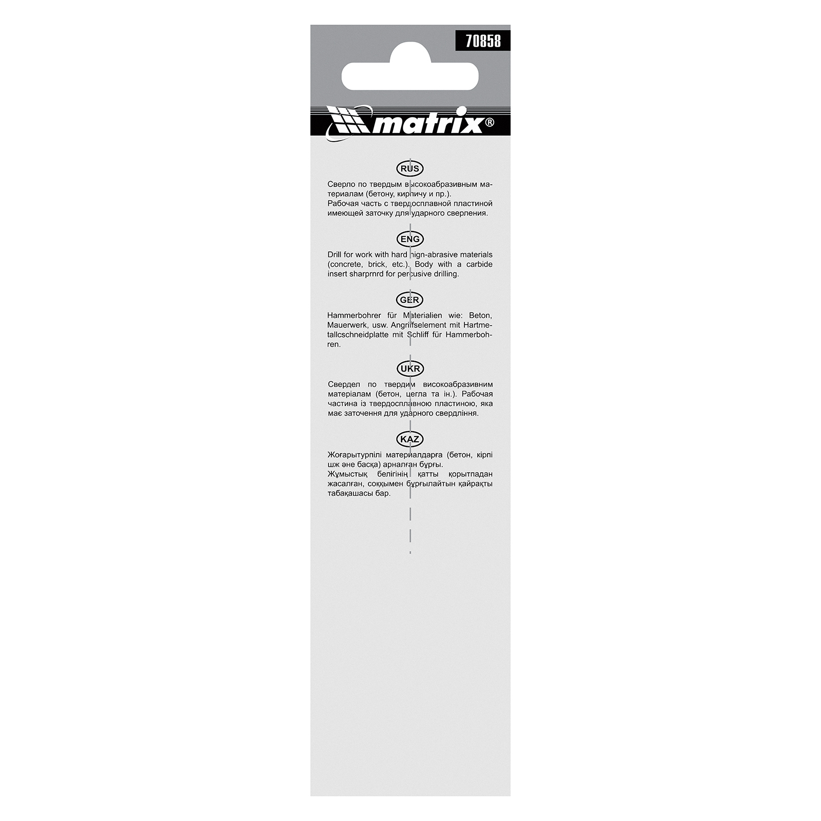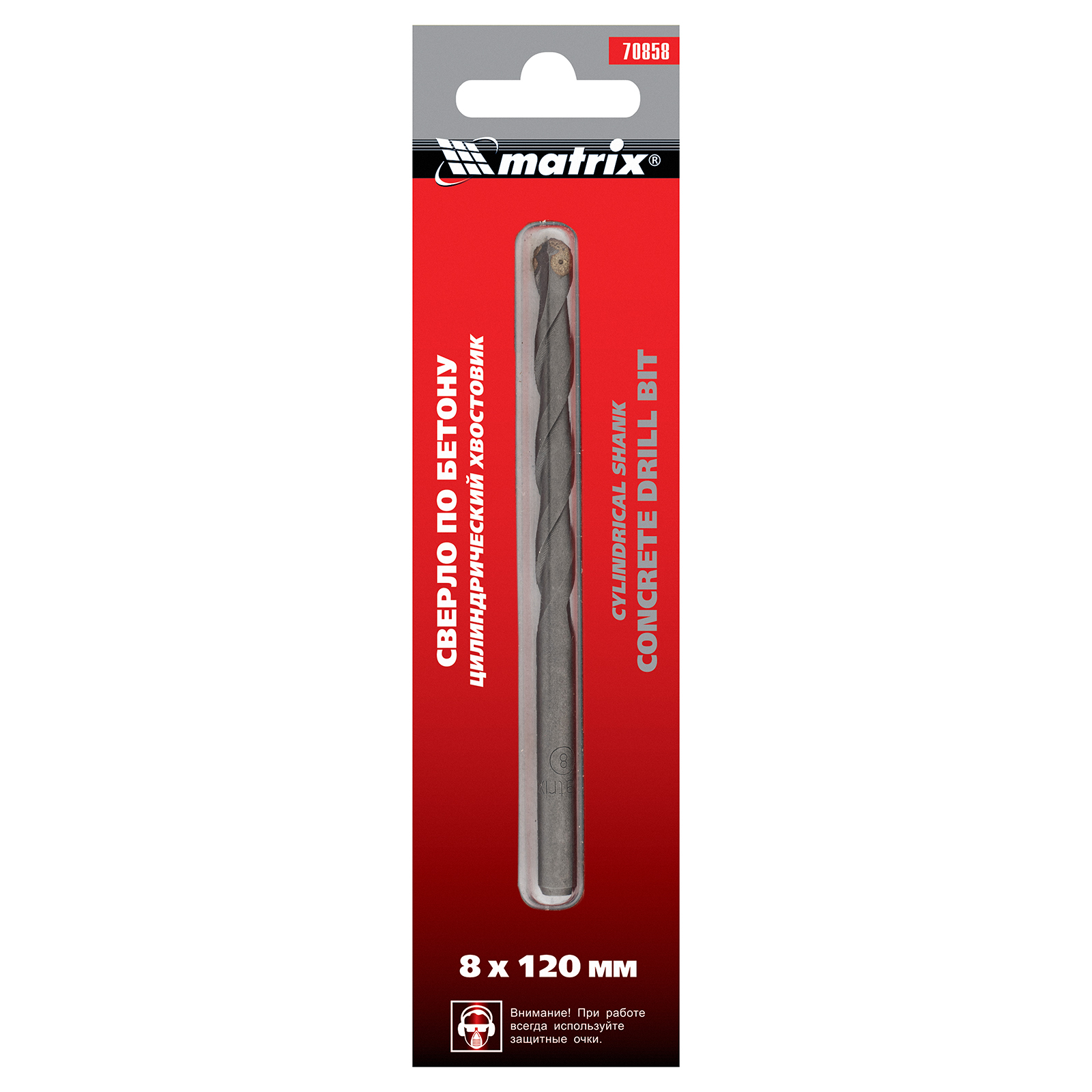 Сверло Matrix 70858 размером 8 х 120 мм, с цилиндрическим хвостовиком, устанавливается на дрель и используется для получения отверстий в бетоне, кирпиче, мраморе и других твердых материалах. Оно рассчитано на полупрофессиональное использование, подходит также для осуществления ремонтных и монтажных работ в быту.