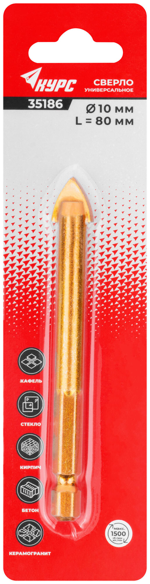 Сверло универсальное по кафелю, стеклу, керамограниту, бетону, кирпичу, шестигранный u-хвостовик под биту, 10х80 мм КУРС 35186