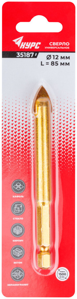 Сверло универсальное по кафелю, стеклу, керамограниту, бетону, кирпичу, шестигранный u-хвостовик под биту, 12х85 мм КУРС 35187