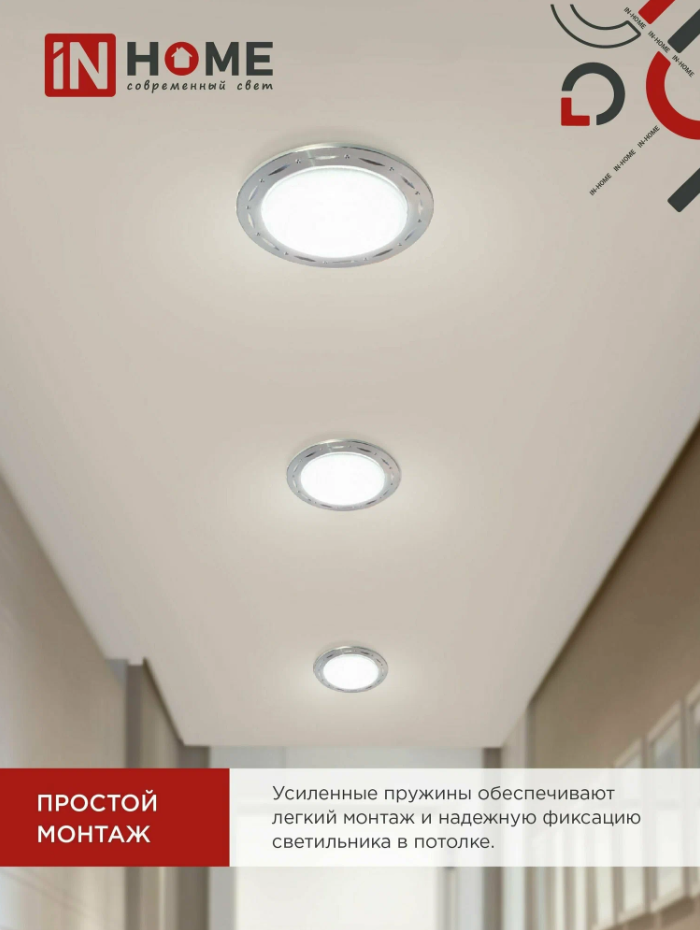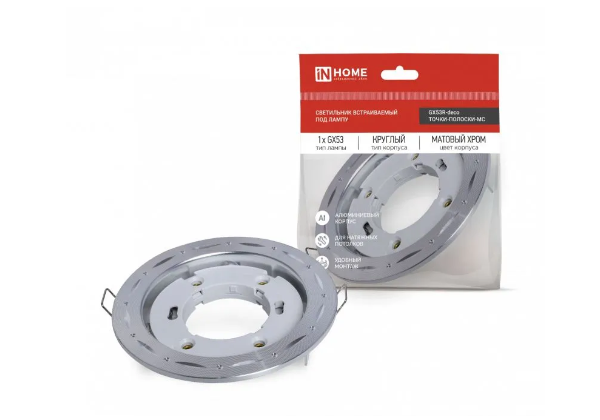 Серия встраиваемых светильников GX53R-glass под лампу GX53 ТМ IN HOME выпускается в двух вариантах декоративного исполнения – эффектном зеркальном и благородном матовом корпусе. Предназначена для работы со светодиодными лампами GX53 мощностью от 2 Вт до 13 Вт и цветовой температурой от 2700 К до 6400 К. Простая в монтаже модель идеально подходит для установки в подвесные и натяжные потолки. Представляет собой отличную замену точечным светильникам под зеркальные и галогенные лампы рефлекторного типа. Экономит до 50% электроэнергии. Светильники предназначены для эксплуатации в сетях переменного тока 230 В. Могут использоваться для освещения жилых и общественных помещений, офисных зданий, торговых комплексов, кафе, ресторанов. Подходят для основных и вспомогательных мест общего пользования (коридоры, лестничные пролеты, столовые, конференц-залы, спортзалы и др.)