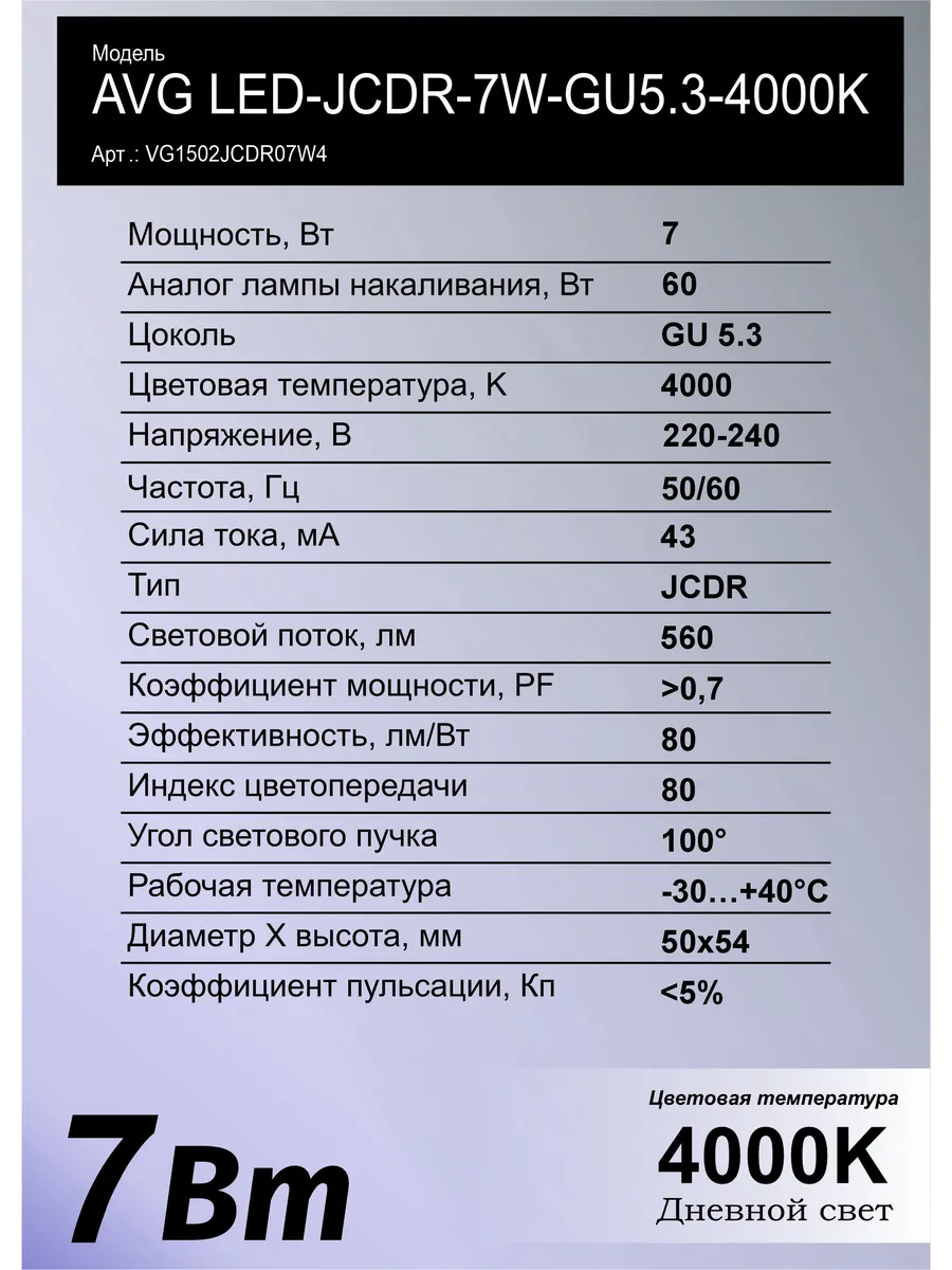 Светодиодные лампы AVG LED 7W 4000K предназначены для освещения внутренних помещений. Высокий уровень цветопередачи обеспечивает полноценное восприятие оттенков и цветов окружающего пространства. Конструкция на основе современных светодиодов соответствует классу энергоэффективности А+. Экологически безопасные. Экономия электроэнергии до 90%. Срок службы в 2.5-3 раза дольше энергосберегающей лампы и в 30 раз дольше лампы накаливания. Высокая ударопрочность благодаря металло-пластиковому корпусу. Мгновенное включение. Без мерцания.