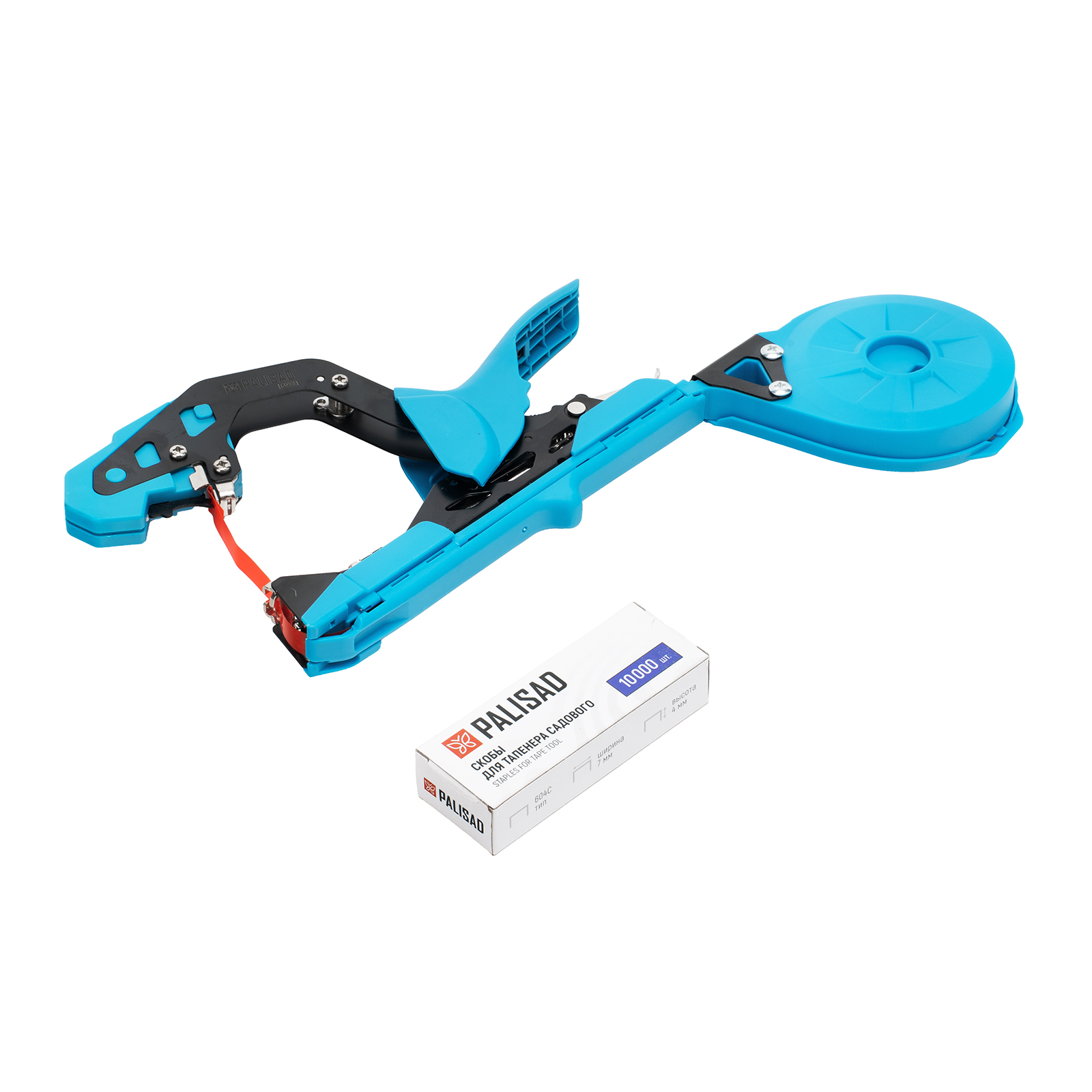 - Удобная комплектация — тапенер поставляется с лентой длиной 30 м (хватит на 600 подвязок) и комплектом скоб, что позволяет сразу приступить к работе.