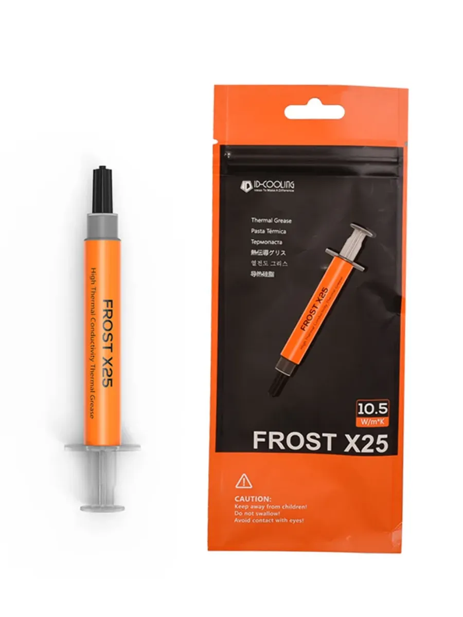 Термопаста ID-cooling FROST X05 используется в качестве теплопроводящего слоя между необходимым устройством и охлаждающей поверхностью. Данная паста отличается показателем теплопроводности на уровне 6.5 Вт/мК и рабочей температурой в пределах 200 °C, что делает ее универсальным решением для процессора, графического адаптера и других компонентов. Термоинтерфейс ID-cooling FROST X05 поставляется в специальном небольшом шприце емкостью 5 г, который гарантирует равномерное формирование слоя и удобство в процессе нанесения.