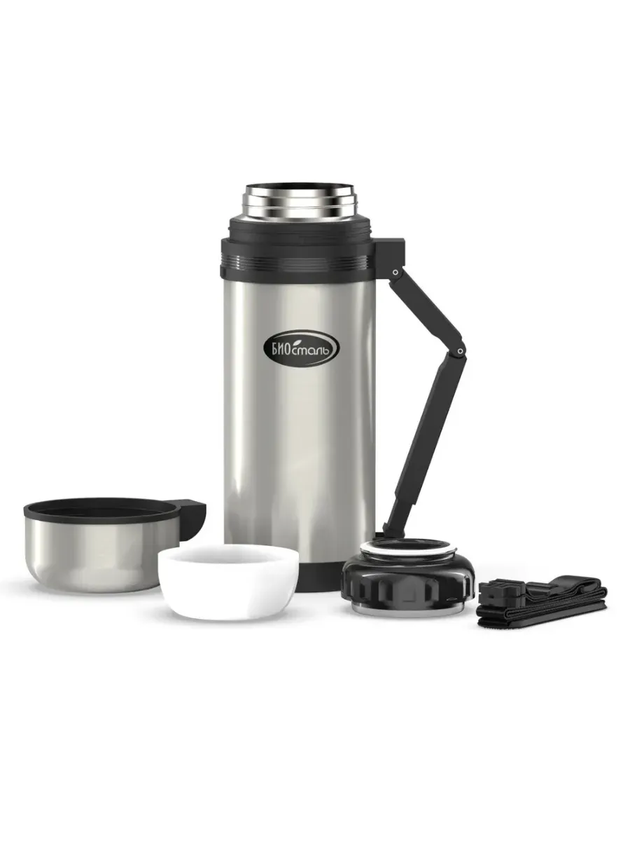 Термос изготовлен из высококачественной нержавеющей стали 18/8 (AISI 304). Крышка-чашка объёмом 380 мл, вторая чашка из пищевого пластика объёмом 200 мл. В комплекте есть ремешок для переноски с регулируемой длиной и наплечником
