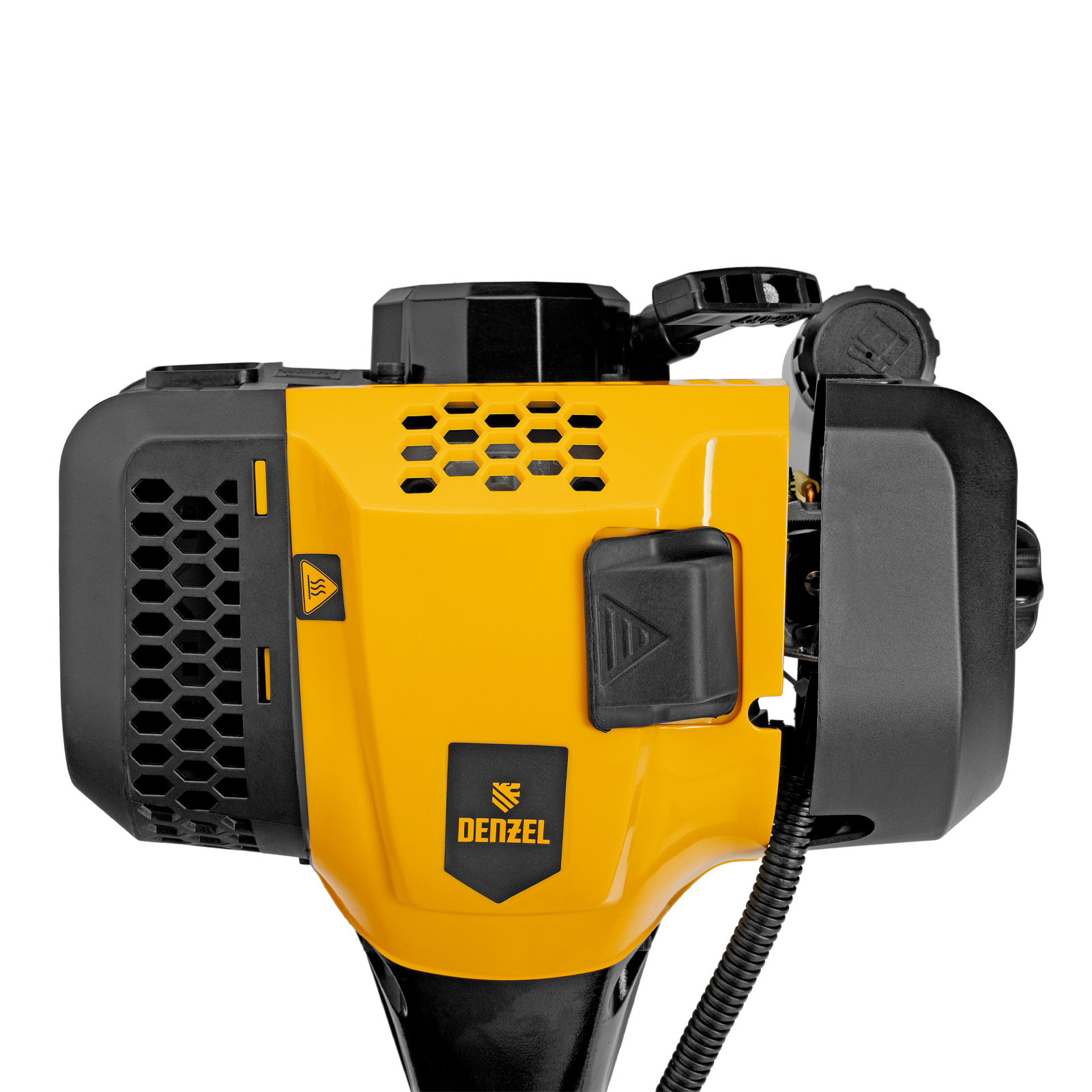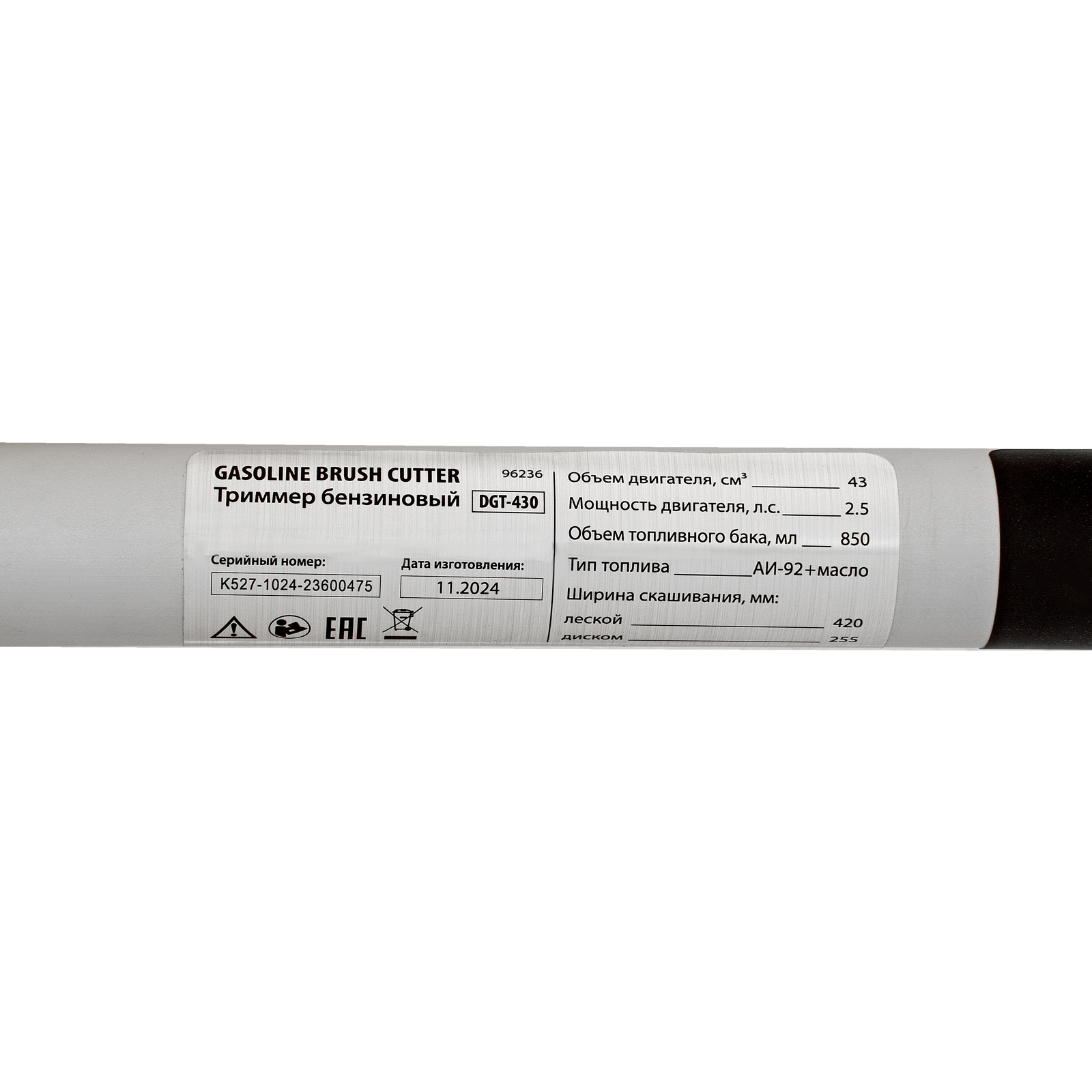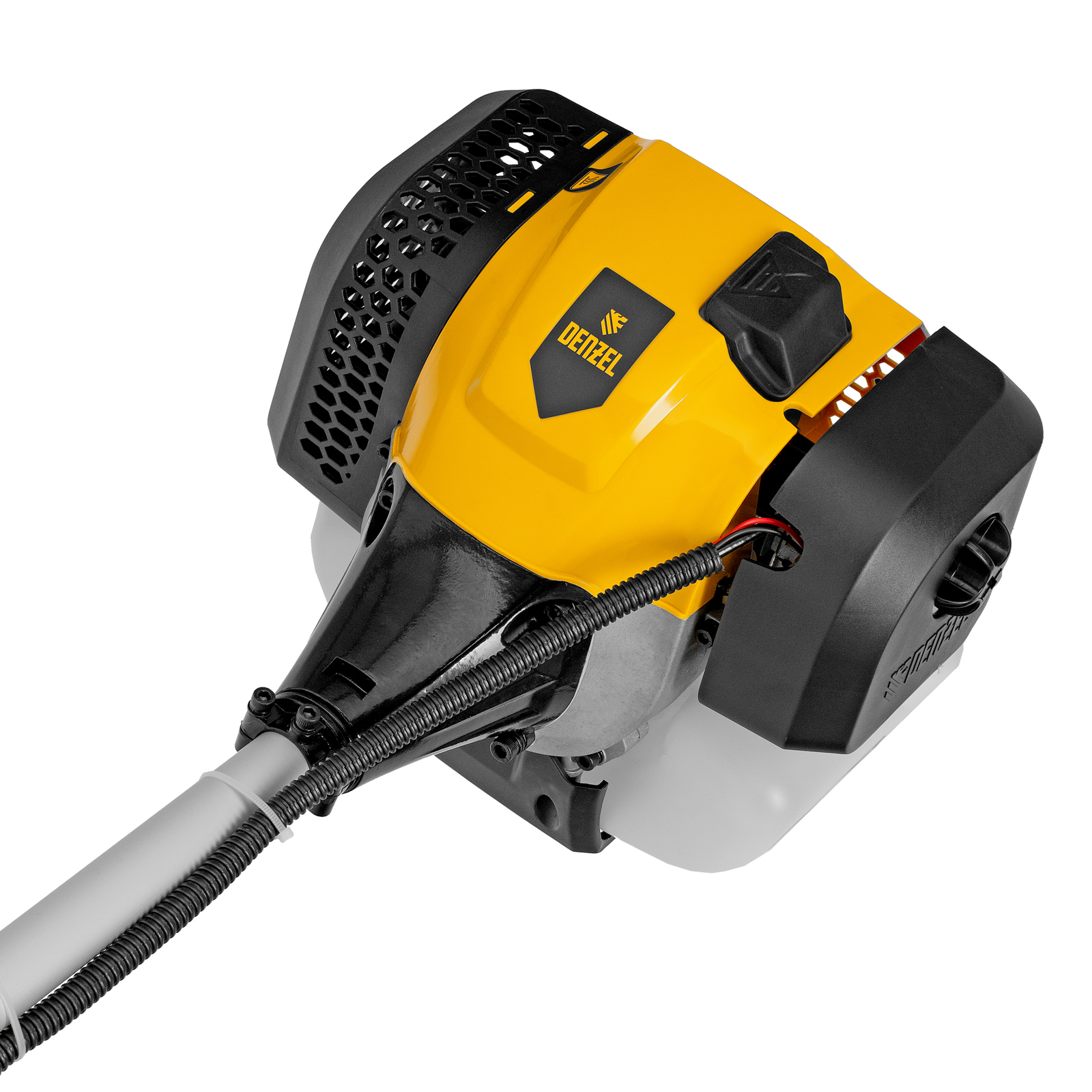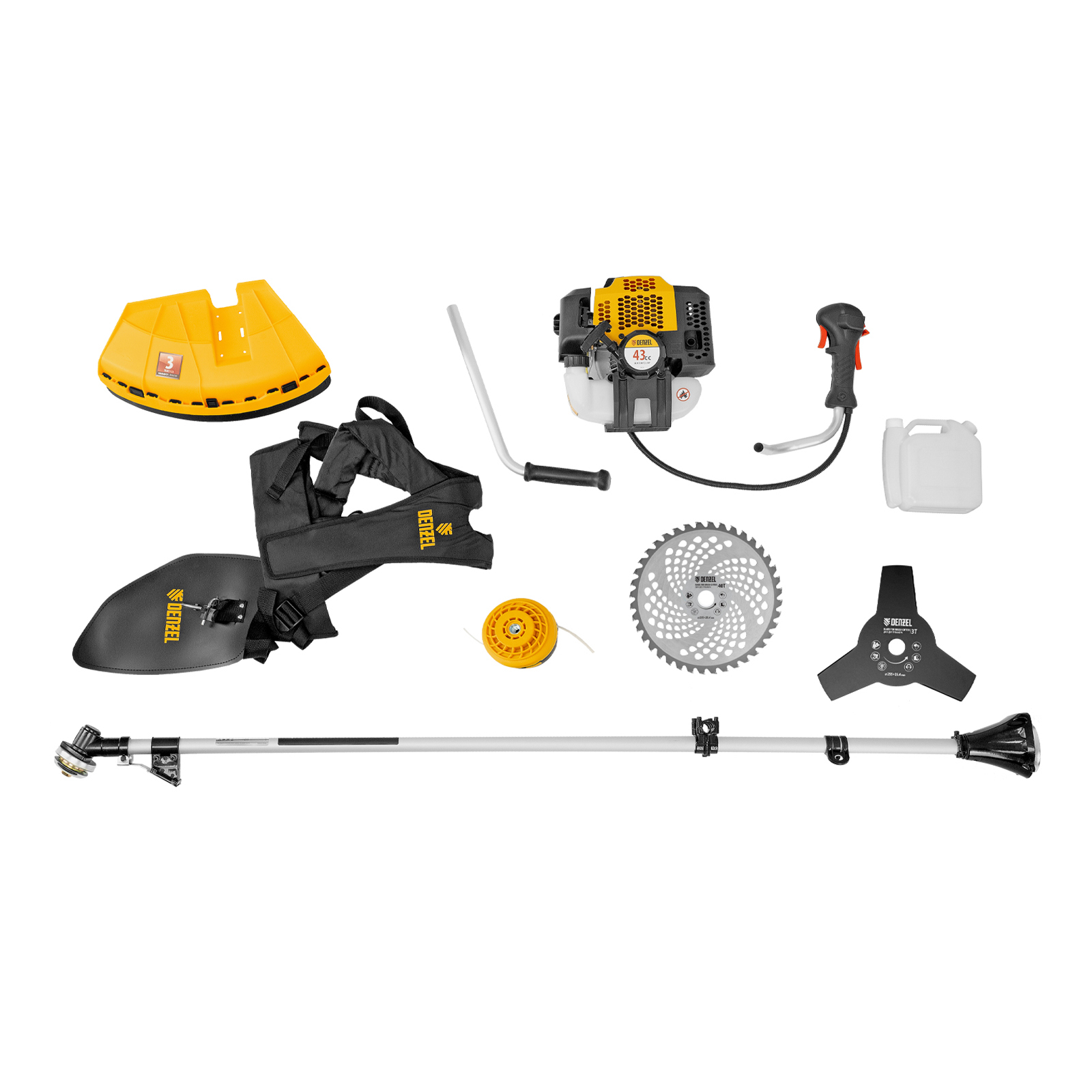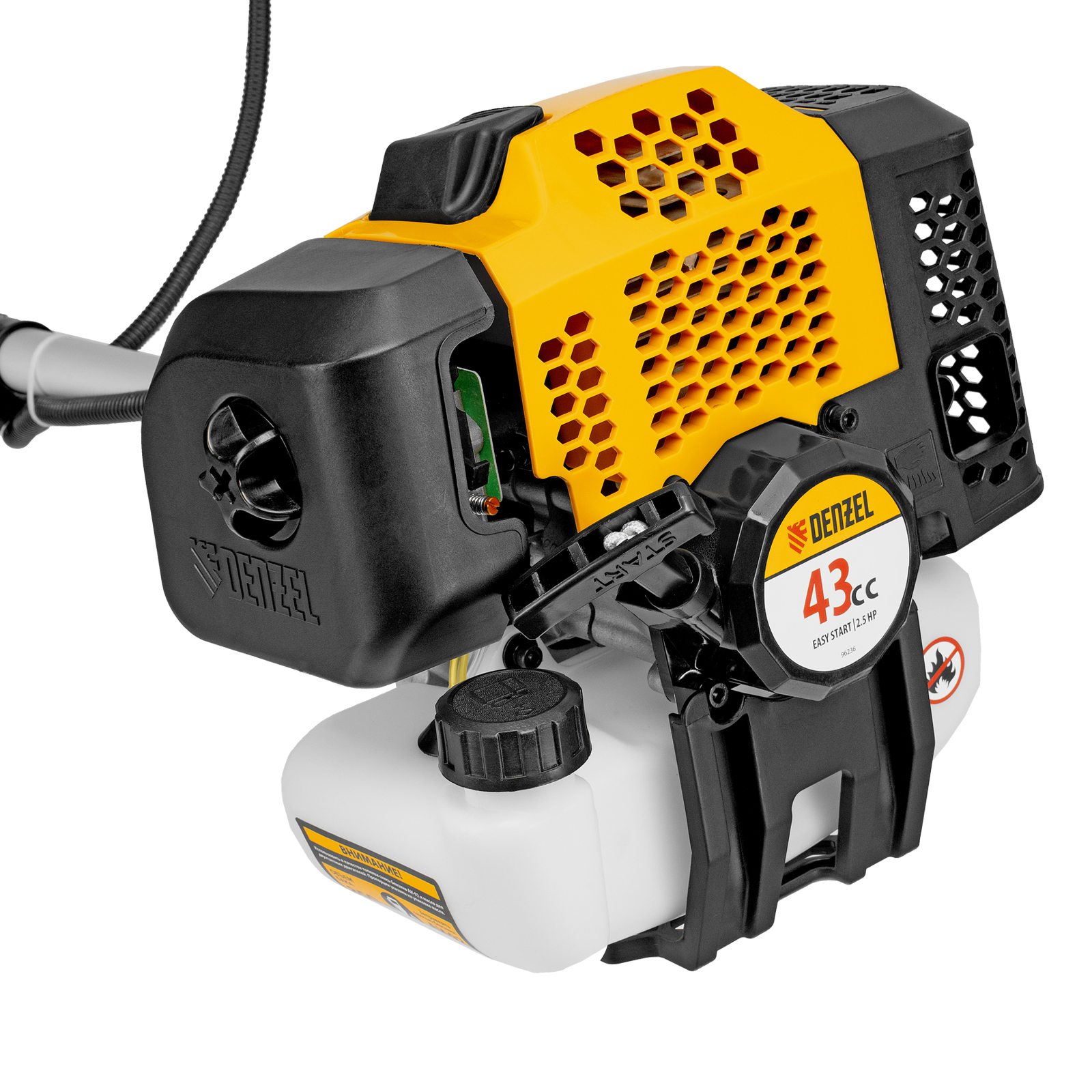Бензиновый триммер Denzel DGT-430 96236 с двигателем объемом 43 см3 и мощностью 2,5 л.с., с неразъемной штангой, состоит из 2 частей. Предназначен для скашивания густой травой и создания аккуратных лужаек, подходит для скашивания травы всех типов, в том числе с жесткими древовидными стеблями (полыни, крапивы, лебеды, борщевика), а также срезания кустарника и молодых побегов деревьев с диаметром стволов до 10 мм. Подходит для мест, в которых с обычными газонокосилками работать тяжело. Экономичный двигатель позволяет эффективно обрабатывать участок площадью до 9-10 соток.,В комплект поставки входят режущие насадки: усиленная полиамидная катушка, трехлопастный нож и пильный диск.