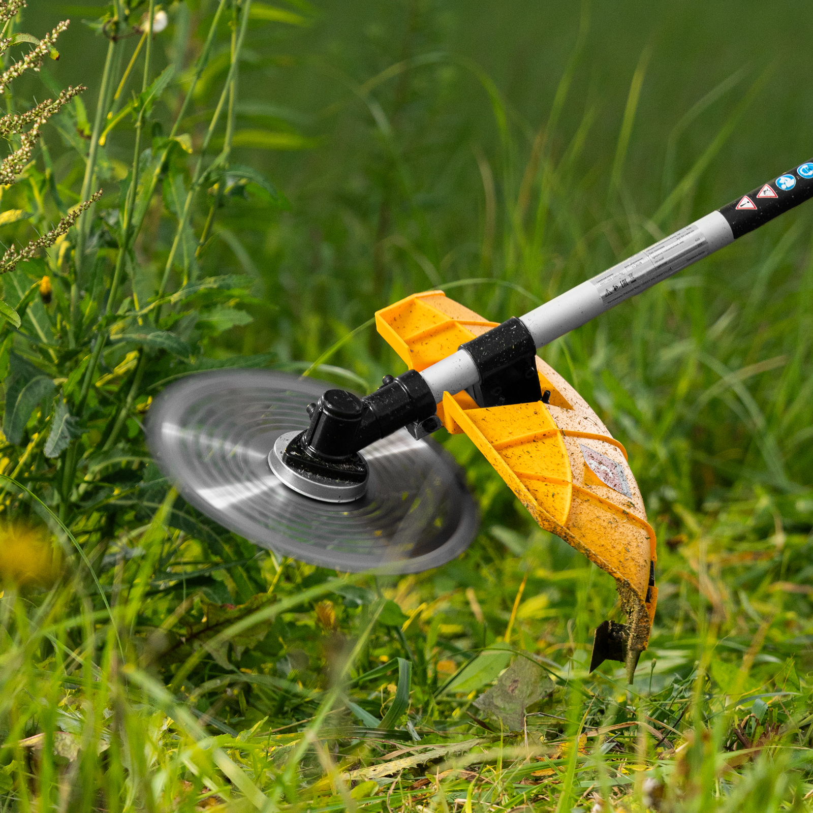 - Дополнительные возможности — можно приобрести и установить на триммер диск Denzel 96323 для быстрого удаления растительности с жесткими стеблями или 96328 для скашивания молодых побегов кустарника диаметром до 3 мм.