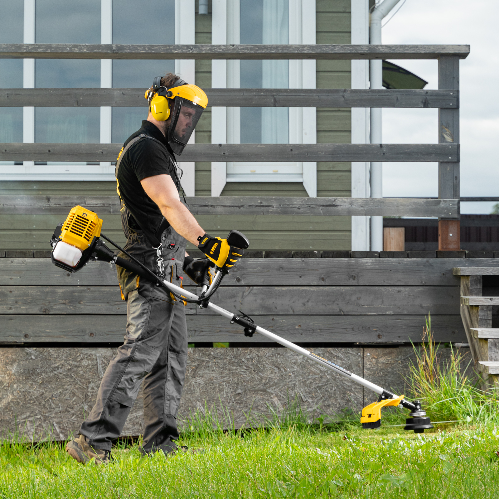 - Удобное управление — асимметричные рукоятки обеспечивают оптимальное положение рук, благодаря весу 7 кг триммер легко удерживать и направлять.