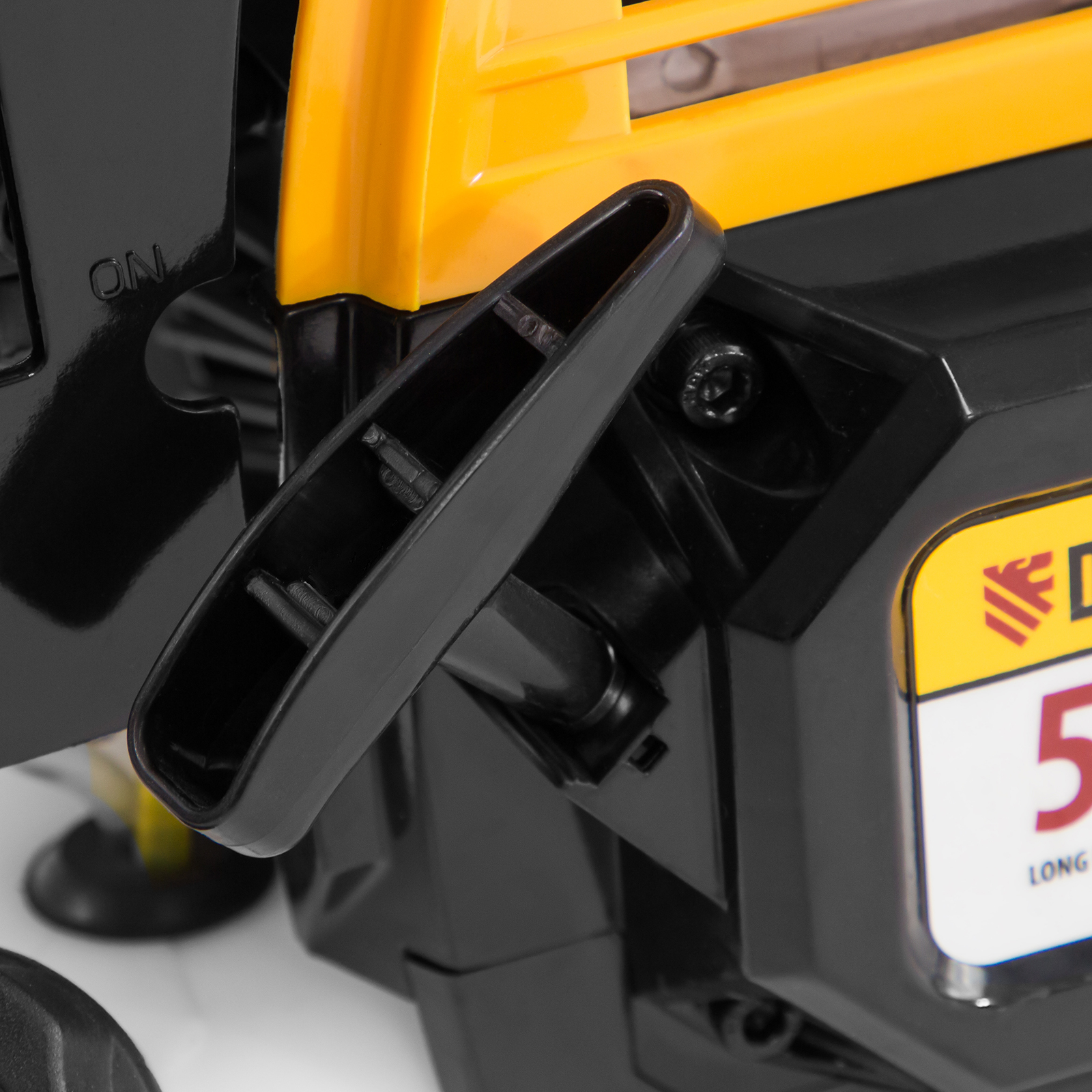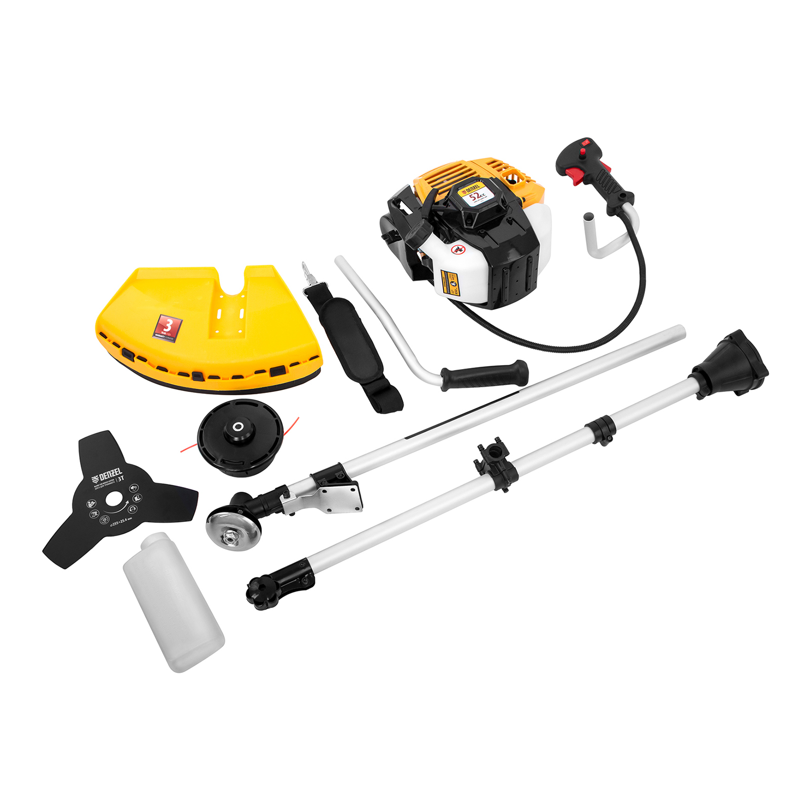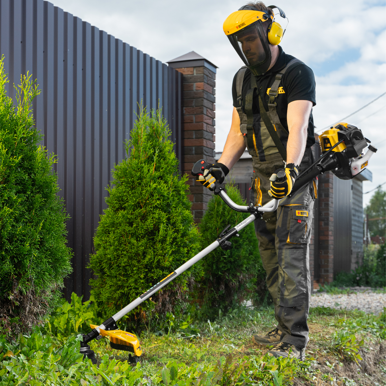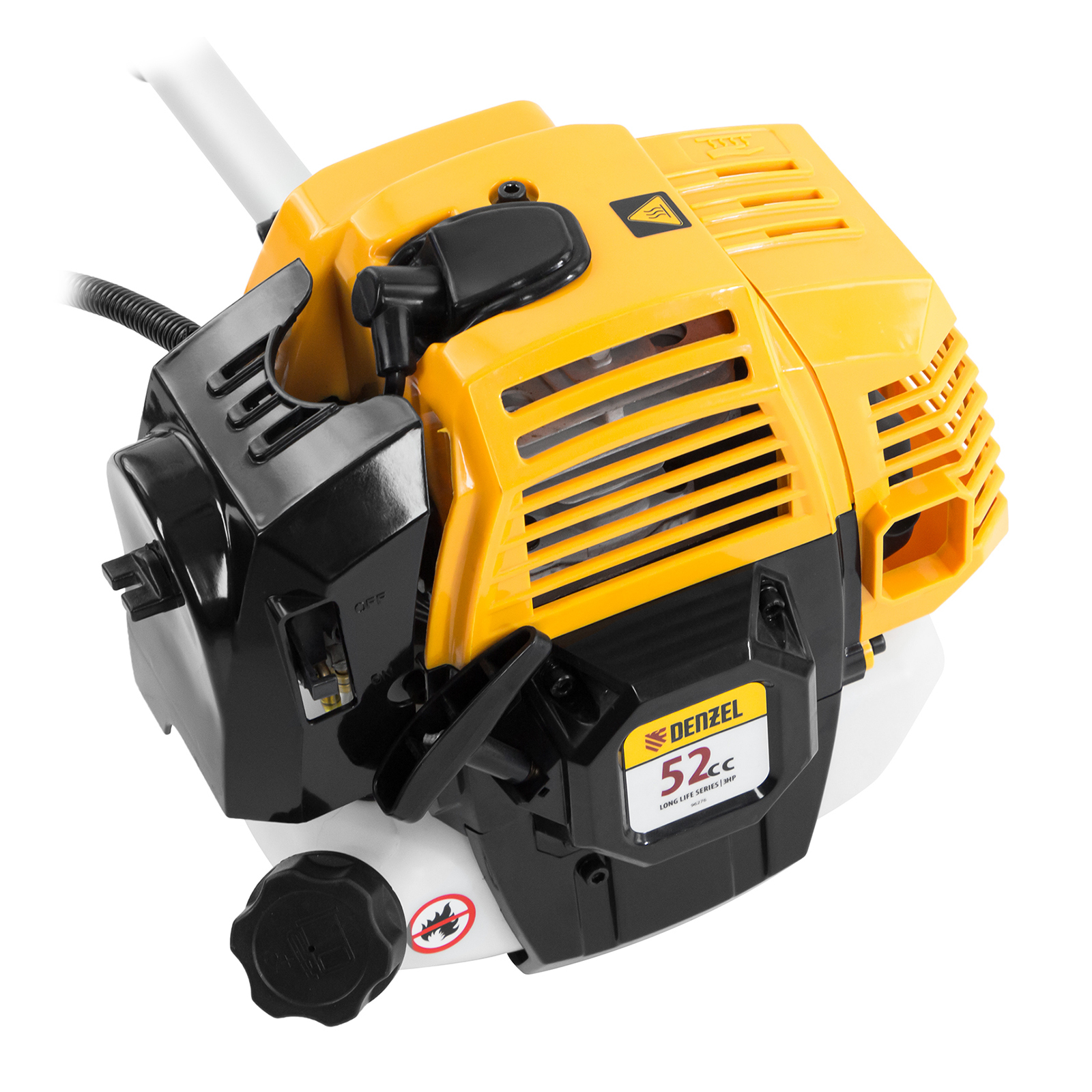 Бензиновый триммер Denzel DR-52S 96276 с двигателем объемом 52 см3 и разъемной штангой, состоит из 2 частей. Используется для ухода за газоном, скашивания травы различных типов, в том числе с жесткими стеблями (полынь, крапива, лебеда). Триммер эффективен на сложных участках: вдоль стен, в ямках и на возвышенностях, вокруг деревьев. Две режущие насадки — трехлопастный нож и катушка с леской — вращаются со скоростью 9500 об/мин, обеспечивая ширину скашивания 25,5 и 42 см. Эффективную работу инструмента обеспечивает двухтактный двигатель мощностью 3 л.с. При этом триммер экономично расходует топливо, поэтому часто заправлять его не придется.