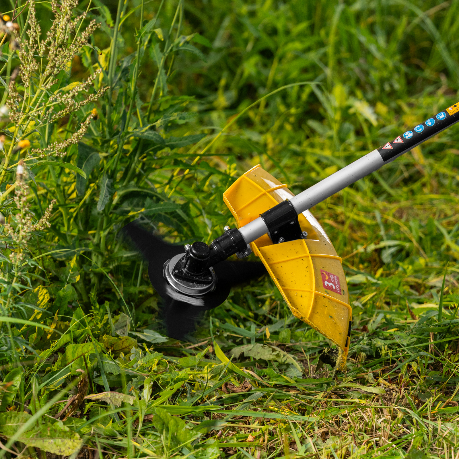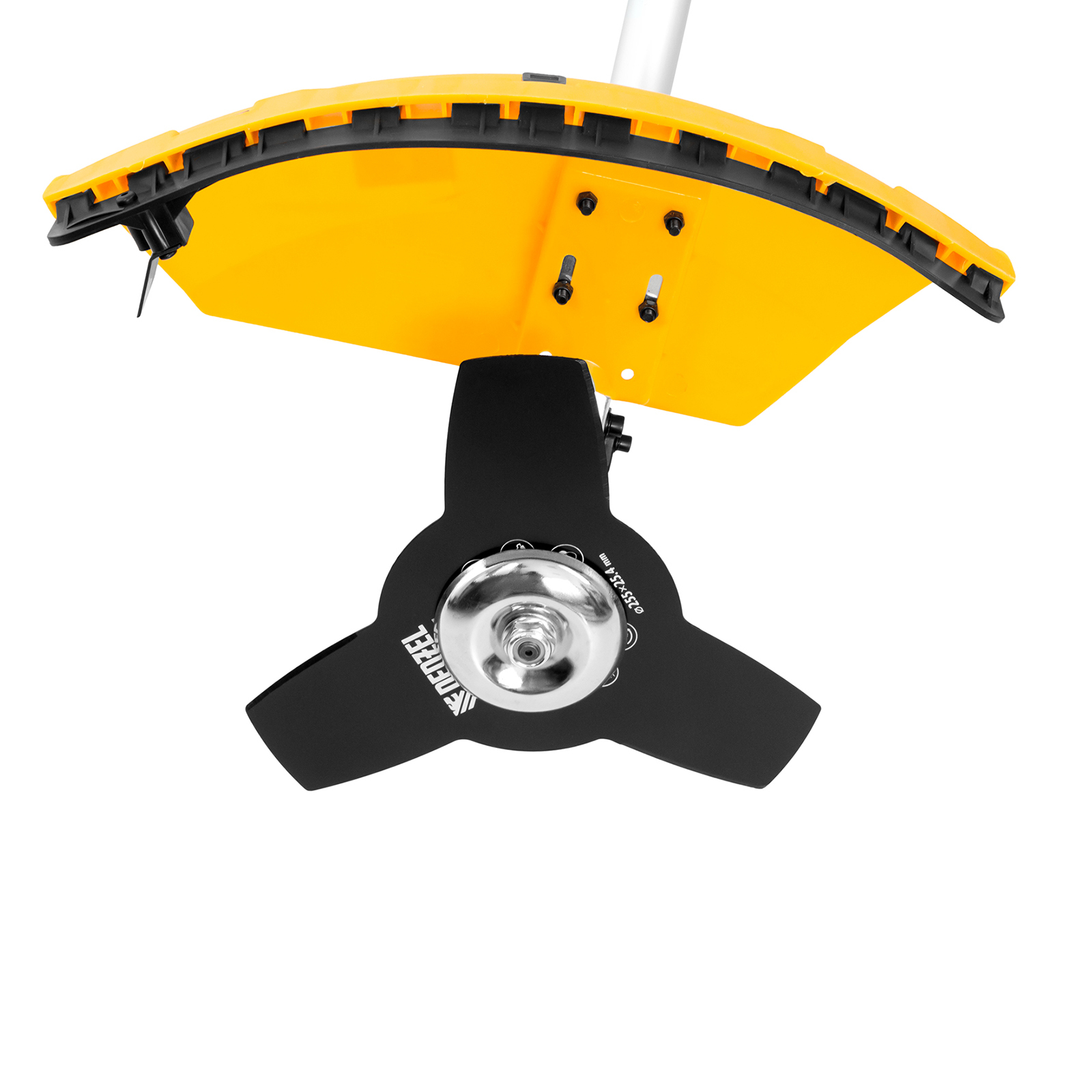 - Дополнительные возможности — можно приобрести диск Denzel 96323 с шириной скашивания 230 мм для быстрого удаления растительности с жесткими стеблями, 96328 для скашивания молодых побегов кустарника диаметром до 3 мм, 96340 для срезания борщевика, кустарника и молодых побегов деревьев с диаметром стволов до 10 мм.