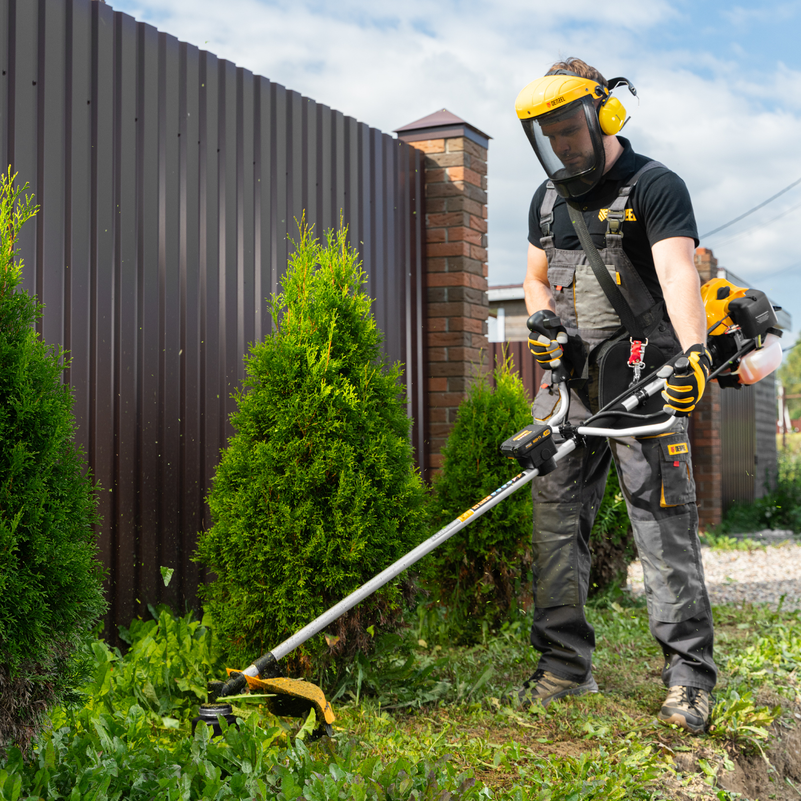 - Безопасность — блокиратор курка газа препятствует случайному запуску двигателя, прочный пластиковый кожух защищает пользователя от летящей травы, грязи и прочих твердых частиц.