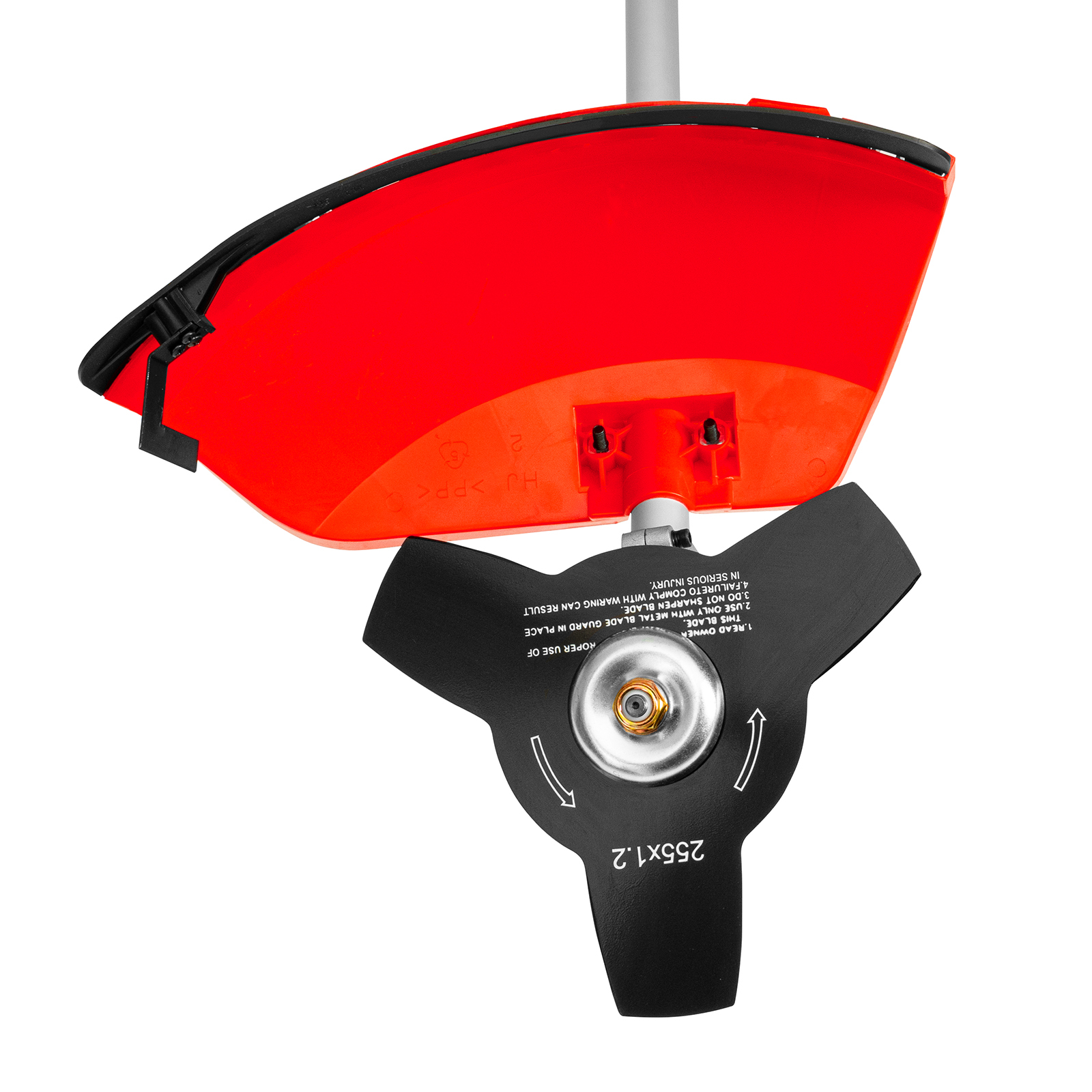 - Безопасность — производитель предусмотрел блокировку курка газа для предотвращения случайного запуска, защитный кожух препятствует вылету травы, веток, камней в сторону пользователя.