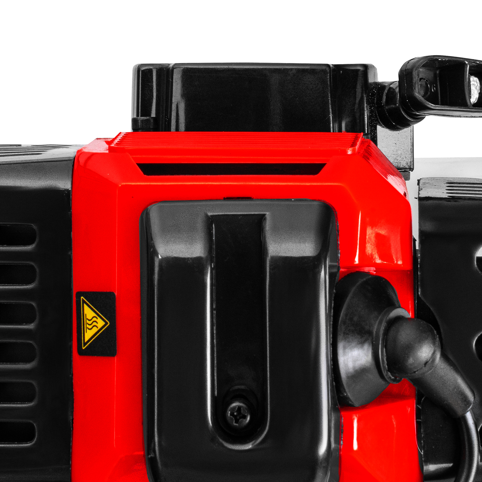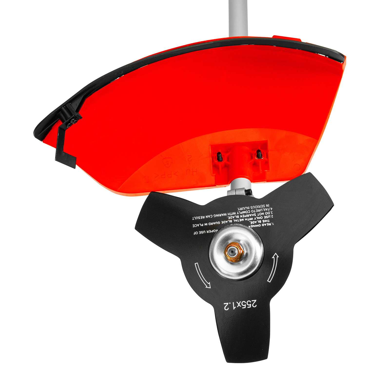 - Безопасность — производитель предусмотрел блокировку курка газа для предотвращения случайного запуска, защитный кожух препятствует вылету травы, веток, камней в сторону пользователя.