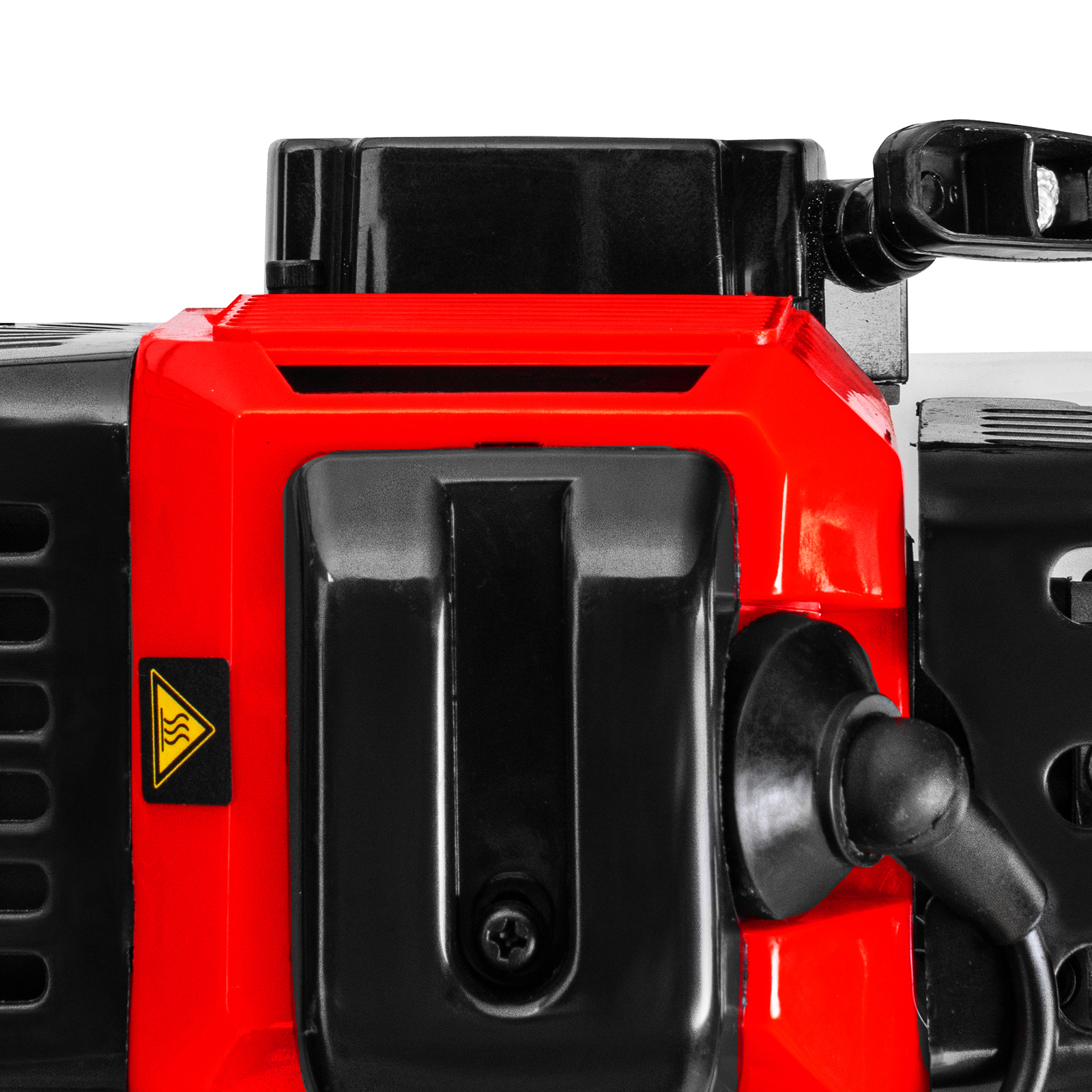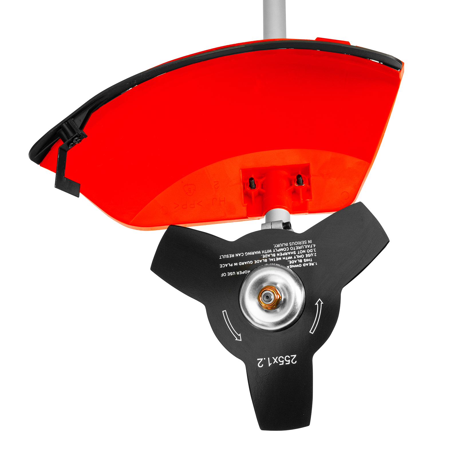 - Безопасность — производитель предусмотрел блокировку курка газа для предотвращения случайного запуска, защитный кожух препятствует вылету травы, веток, камней в сторону пользователя.